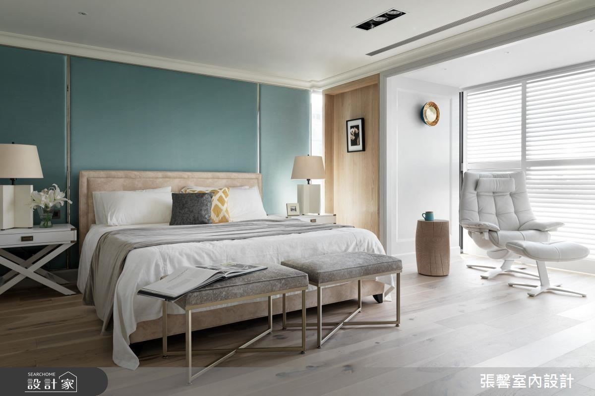 营造舒适的卧室氛围,设计师为地板铺上了温润的木质建材,并应用至壁柜上,再搭配蓝色的床头墙,让空间既纾压又有层次感。另外,阅读桌的设置,以及独立的更衣室、全套卫浴等设备,满足了私领域的机能性及居住需求。
