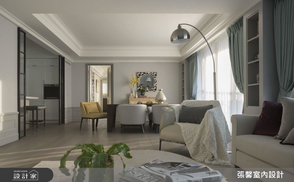来自窗外的温暖阳光,穿透网纱窗帘照亮公领域的一景一隅,并以白、深浅灰色打底的空间里,展现安定人心的气息;搭配局部妆点技巧,以跳色抱枕、粉色系画作及金属吊灯等,替美式风格创造视觉亮点,提升风格时尚度。