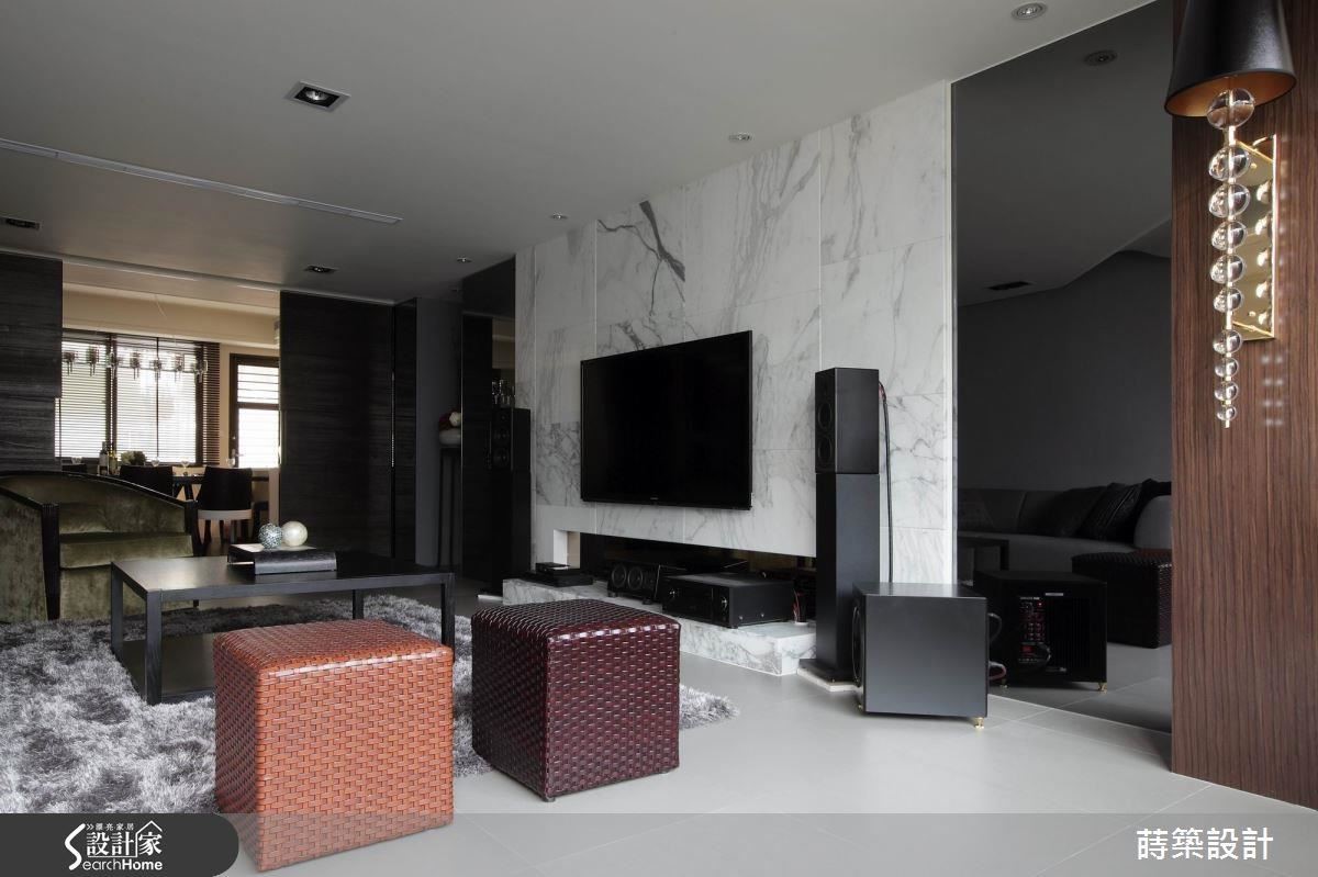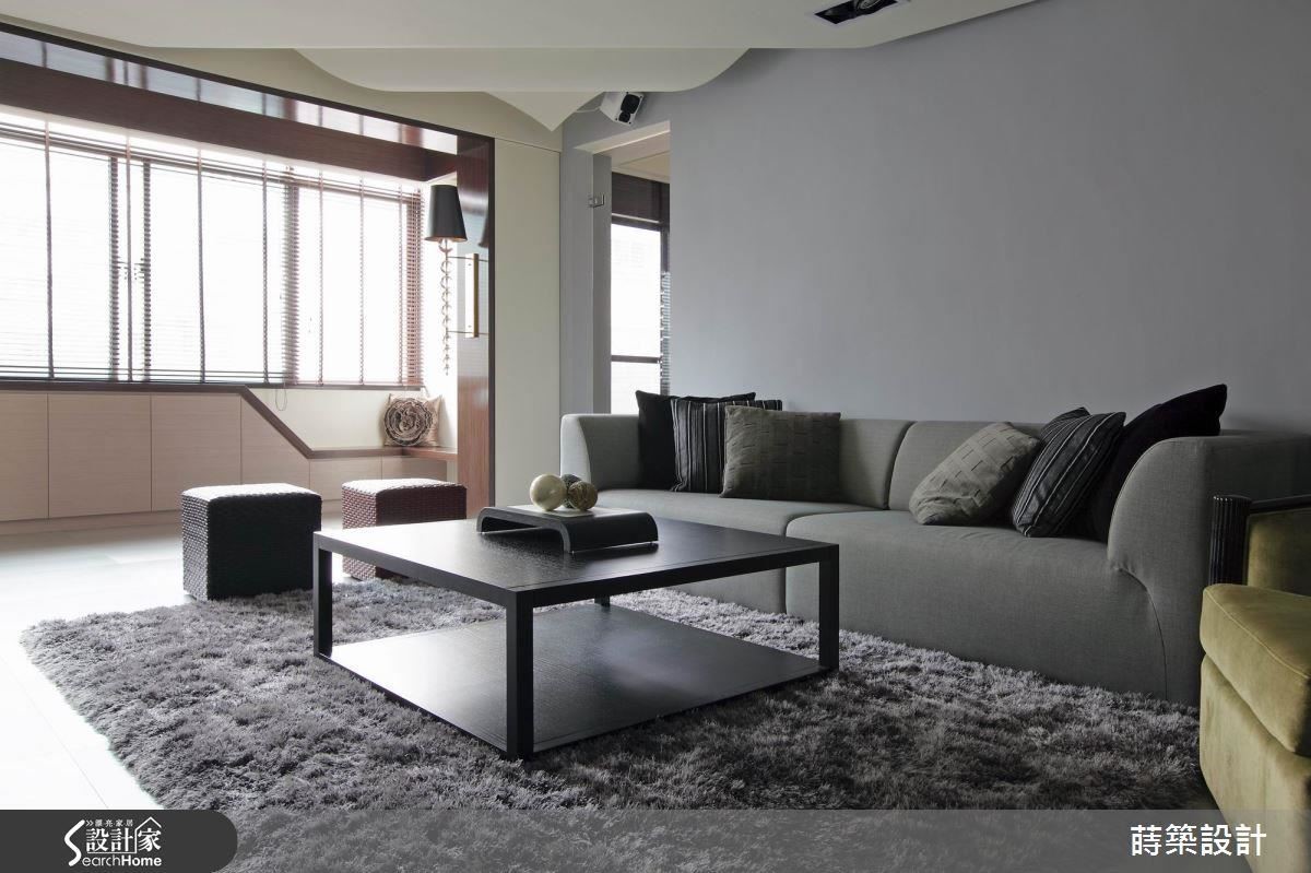 酒店风格的基调下,客厅天花板特别加入律动线条,呈现宛如波浪起伏般的造型,替室内带来生动朝气;其次,采用灰阶沙发背墙与沙发、地毯等,透过随兴的软件布置,彰显柔和的空间韵味。