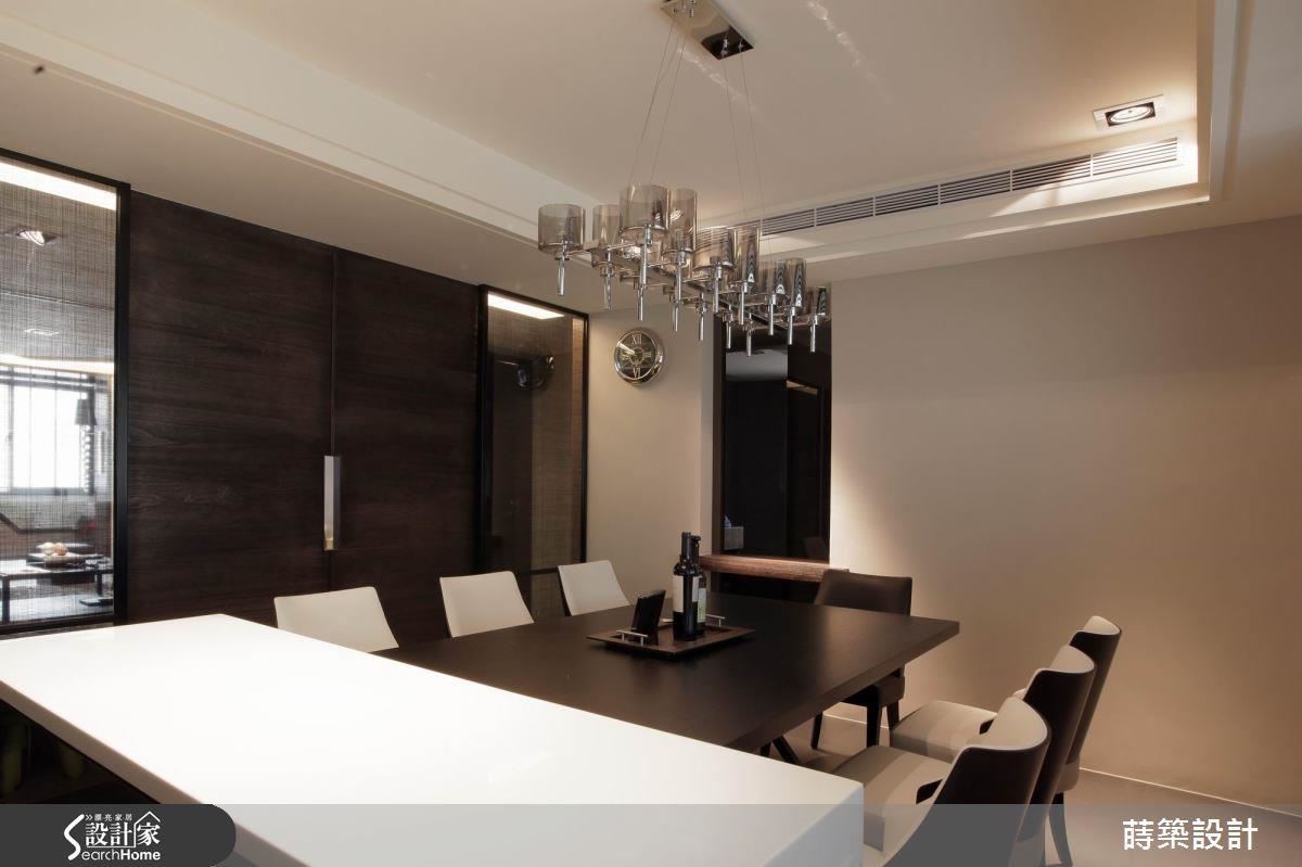 餐厅的装修没有繁复元素,相对简单的空间里,运用线条利落吊顶设计,搭低奢气息的餐桌椅及吊精致吊灯,汇集视觉焦点及氛围。另以推拉门片界定餐厅及客厅,门片采以木质搭配茶镜,让场域彼此区隔但保有视觉串联。