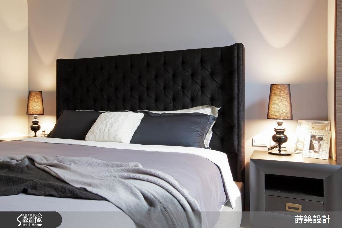 白色为基调的卧室,刻意打造了黑色绷布床头,而且将尺寸提高,搭配两侧妆点典雅床头灯,赋予空间精致优雅的品味。其次,满足女主人日常的使用需求,规划了更衣空间,除了便于收纳衣物,也有专属的梳妆天地。