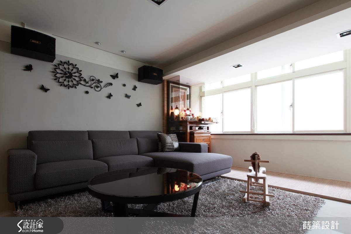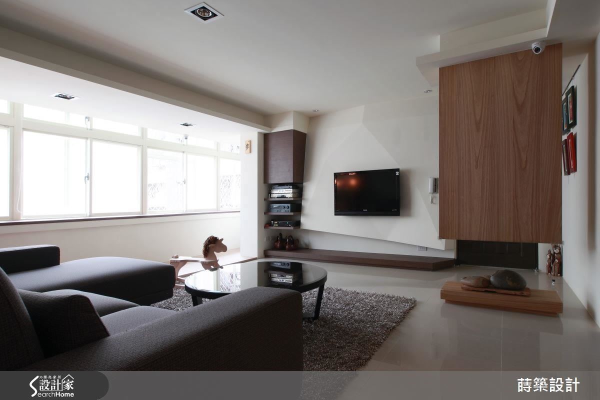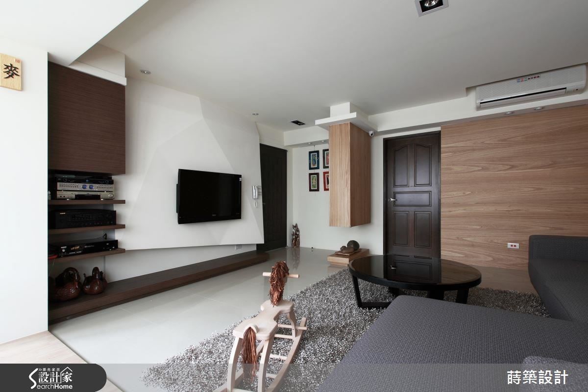 重视隐私的前提下,设计师在开放式的公领域,设置了木作吊柜,一方面界定玄关场域,同时也适度阻挡门外视线,增加内部结构的严谨性;而且多了柜体,也能满足收纳鞋物的需求。另外,也善用转角梁柱的畸零空间,打造收纳层架作为放置视听产品之用。