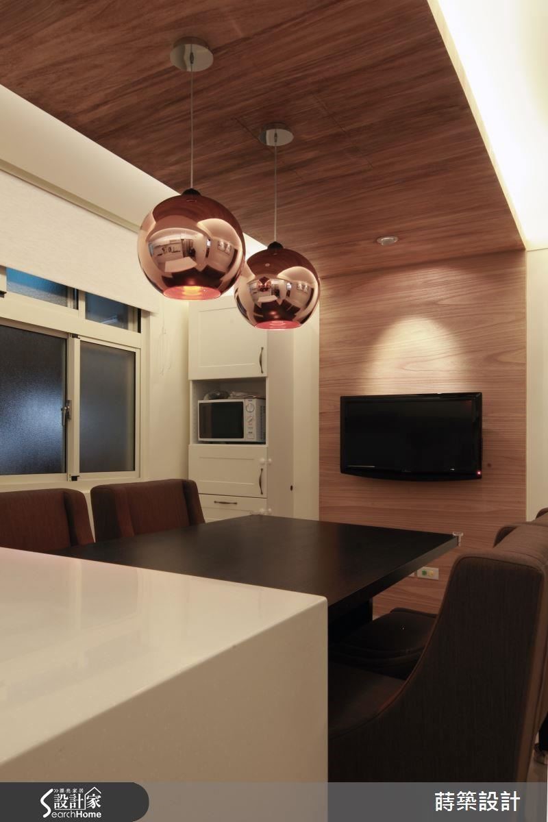 用餐空间采用木皮为天花进行框设,佐以吧台结合餐桌的T型设计,给予一家人充满温馨及安全感的好设计,宽大的台面也便于备餐使用。至于现代感气息浓重的纯白一字厨房,让烹调时光时尚又舒适。