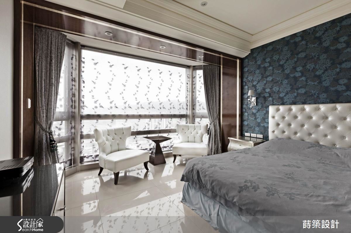 至于卧室,设计师以典雅线板的装修天花,墙面则铺饰纹样富丽的墙纸,藉此烘托精品质感;步向落地窗旁,窗外风景由窗棂引渡,再放上珍珠白的拉扣单椅,建构出都市风貌与生活的对话。