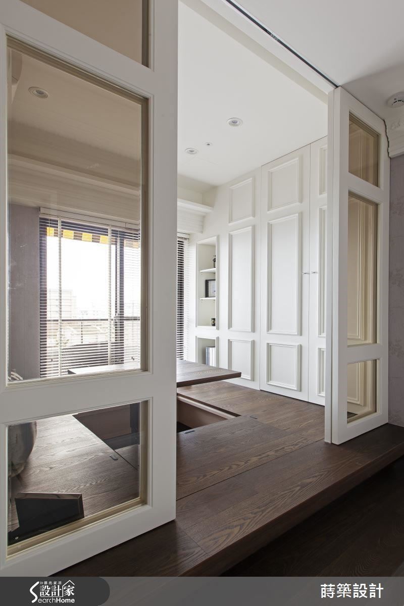 格局里的两间房,其中一间规划为多功能休憩空间,并特别以和室形式呈现;其中,架高的地板内藏升降式矮桌及收纳空间,加上墙面的线板格柜设计,提供完整的储物功能,进而赋予客房及游乐的角色,让欢聚不再是小户型的困扰。