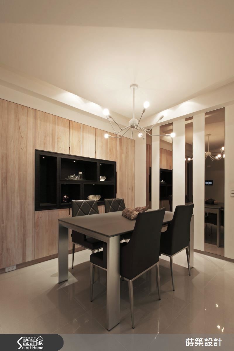 餐厅则延续梧桐木的温暖情境,并规划实用的餐边柜且内嵌展示空间,陈列精致摆设融入艺术气息;其次,侧墙上交错妆点镜面,一方面呼应天花悬吊的造型吊灯,增添前卫氛围,隐隐约约的反射作用,也有扩容效果。