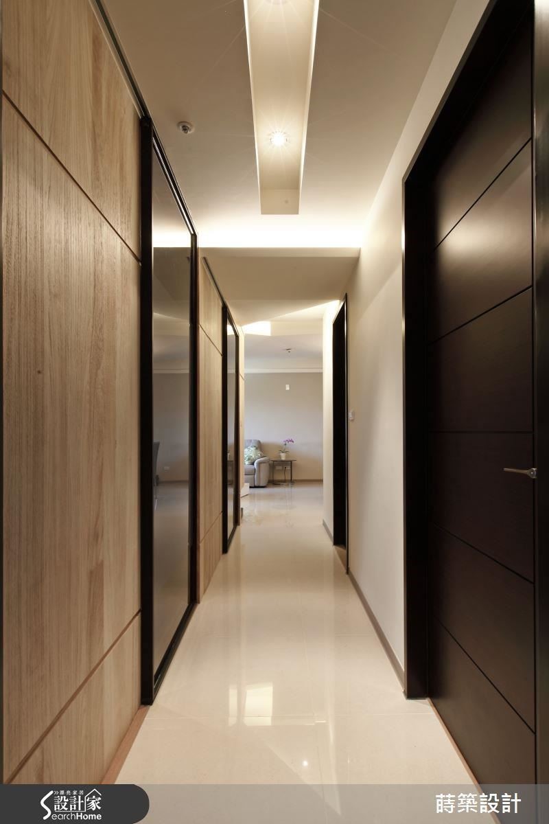 廊道立面让木皮、茶镜、茶玻等交互穿插,透过异材质拼接,解放视觉限制,打造立体层次之美;另在天花部分加入灯沟设计,透过延展线条、灯光照映等创造悠远的视觉景深,让人一进门就能感受空间设计之美。