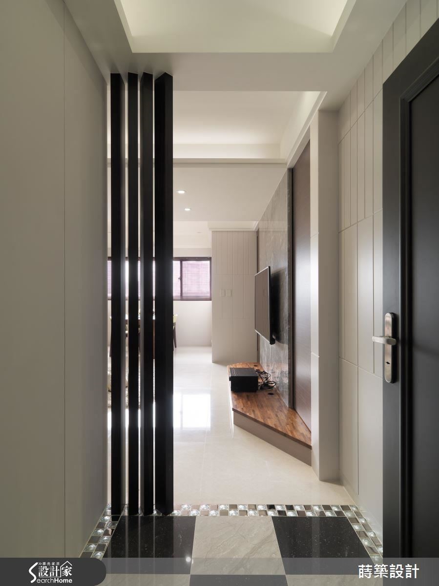 即是简约风格,但整体氛围却一点也不简单!玄关地面铺设马赛克黑白拼花,强化入门场域的空间意象及视觉效果,并作出局部格栅,在视觉上营造延伸的连贯效果。