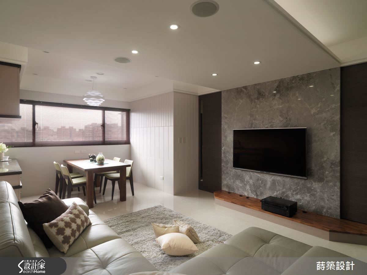 延伸至客厅场域,设计师除了运用地砖,另以大理石铺陈客厅的电视墙,并建构对称格局,将门片隐于其中,结合天花板延伸线条,构成厅区的大气气势。