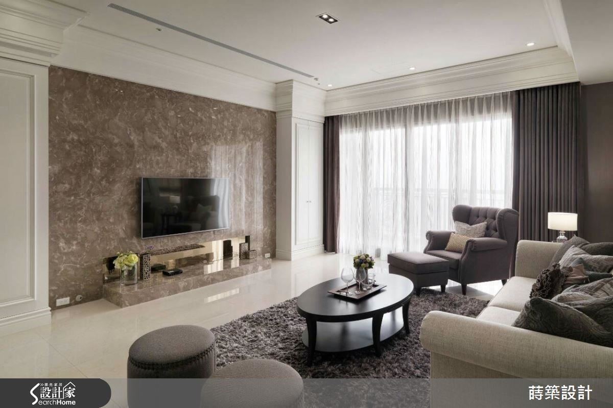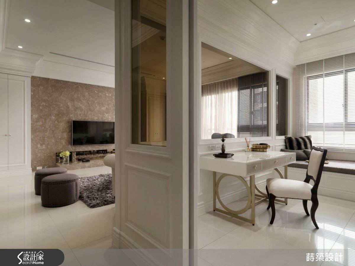至于新古典风格常见的均衡布局,设计师将其发挥在电视墙两侧的柱体,以及取代沙发背墙的书房隔断,借着利用对称线板创造雍容大器之感。其次,透过定制玻璃,让书房同时兼具隐私及通透感,并提高家人间的互动度。