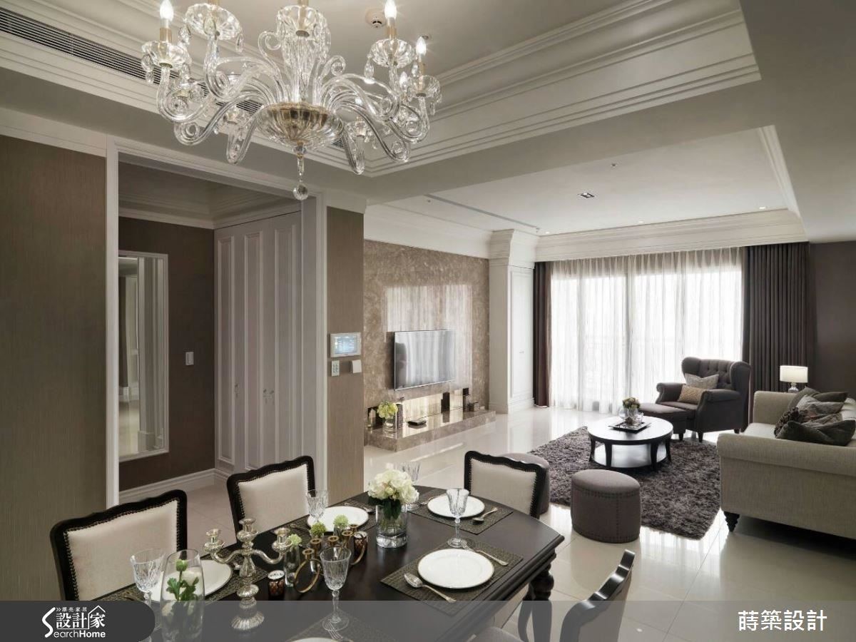 善用蛇型设计的优美弧形,为餐厅桌椅更添精致细节,佐以上方的水晶吊灯及复迭墙纸,让人彷佛坠入十八世纪的时光隧道。另外,餐厨之间采用格状玻璃推拉门,达到阻绝油烟、同时不减通透感的效果。
