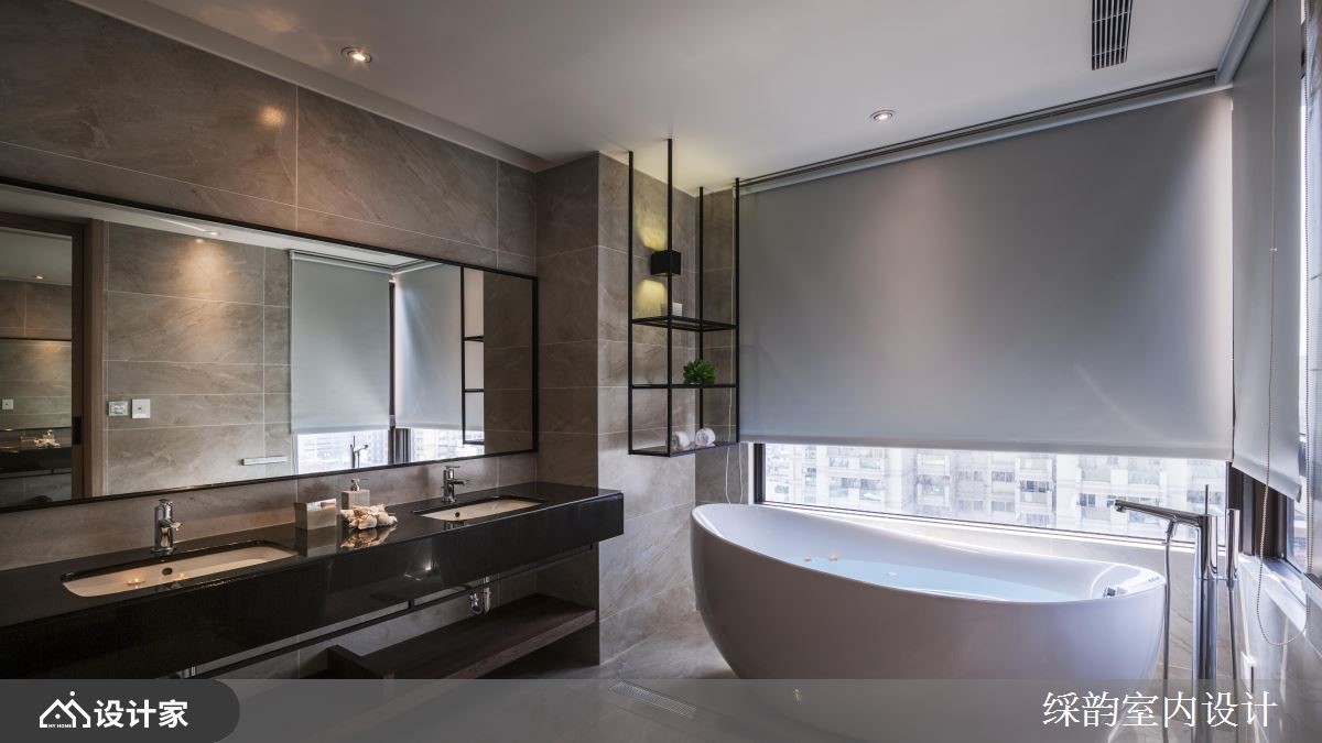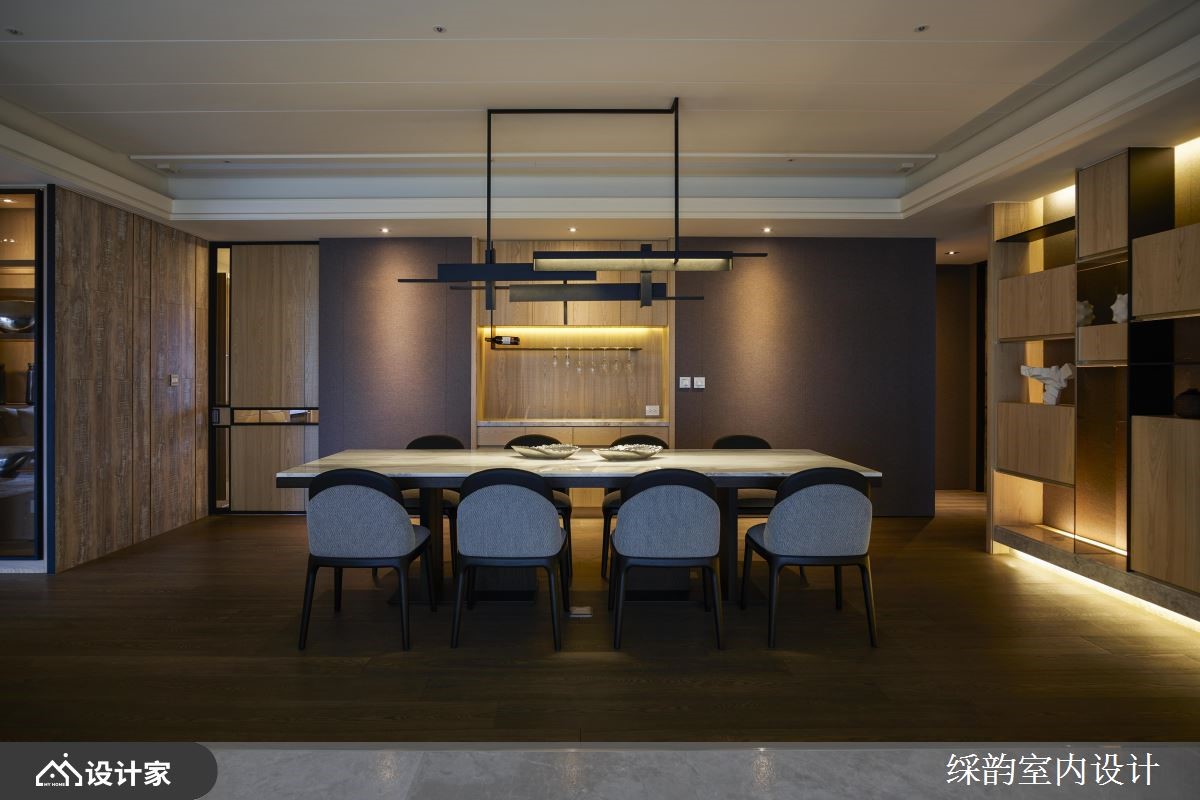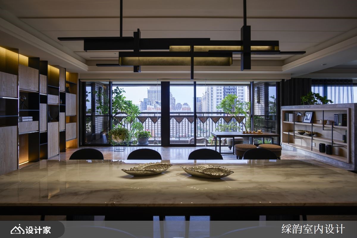 大面采光引入都市风光,室内以现代风格为设计主轴,藉由深色调的木纹饰底,搭配石材、铁件等丰富质材堆栈,交织出自然大器的人文宅邸,让人沉浸在优雅且写实的生活质感中。【温润木纹,优雅诠释人文意境】玄关区以旧质感的木纹铺陈墙面,前方以简约线条的矮柜陈列艺术作品,右侧则以腾空层架诠释屏风机能,通透器皿里插上几根枝叶花卉,流露自然的人文意境。深色调的木纹铺叙公领域地坪,沙发背墙以不同厚度的薄石片拼接,嵌入不锈钢饰条,悬挂几幅艺术画作,随着天花板嵌灯的映照下,传递静谧优雅气息;半高的石材电视墙成为领域界定,区隔出客厅、泡茶区与餐厅,泡茶区里以架高地坪,泡茶、喝茶之际还能欣赏阳台的绿意美景,好不惬意!电视墙背面利用铁件与木作层架转化为书架,其利落的分割线条,巧妙与木皮、铁件与金属创造的书柜墙相互呼应,错落有致的视觉造型,替幽静的空间气息注入趣味活泼性;餐厅领域透过大量的大地色系衬底,在间接光源的映照下,调和出温馨自然的飨宴氛围,餐桌上方是设计师独家订制的金属造型灯饰,让空间线条的延伸与切割技法的展现更完美对称。