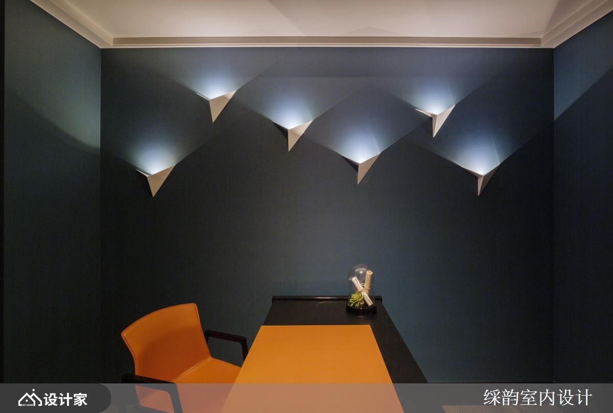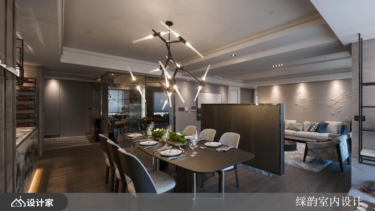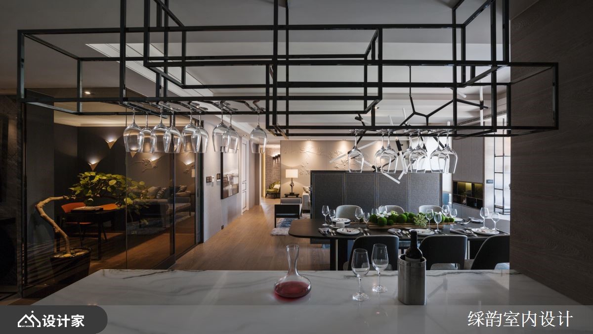 现代豪宅的质感取决于大坪数与小细节,在展现恢弘气度与精致意境的同时,也需映衬出屋主的生活品味。在公共领域的格局部分,设计师以开放式手法诠释通透宽广的空间感,并在客厅与用餐区巧妙运用电视墙做为区隔,其造型优雅如屏风,既是空间场域的界定、两侧更保留动线,游走渺渺虚实之际,轻盈利落地划出场域机能。客厅主墙上的花叶枝枒手工皮雕图腾,精致细腻手感与恢弘气势的场域空间相映其趣;餐厅主灯有如装置艺术般散发前卫及时尚氛围,让整体空间有了视觉焦点;而餐厅靠窗之处即是品茗区,全家人皆可在此惬意泡茶、轻啜热饮,搭配落地窗迎来的充沛光感,品味一室暖阳茶香。除了东方意象「水墨纹理」中岛吧台,镀钛杯架与灯具的金属调性也诠释出对比极高的都会气息,茶香、酒意、石材、木纹,藉由风格与建材的层次迭合,展现大坪数豪宅的低调韵味。步入书房,灰蓝基调的空间色系和造型壁灯呈现独特风格;主卧房则延续公共空间的视觉主轴,一方面打造低调沉稳语汇,二方面更在细节之处彰显极其精巧之工,像是床头墙面的菱形皮革纹理、穿插深浅双色设计等,重写豪宅空间规划的风格情韵。小编的最爱中西合璧的开放型餐厨空间好迷人!大理石水墨纹理的中岛吧台让居家空间更有视觉焦点。