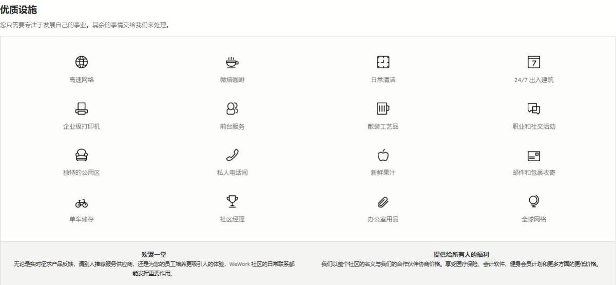WeWork支持创业者所需要的工作设备与环境,从1个人到500个人都能进驻加入会员,提供的设备包括必备的WIFI、视频会议室、畅饮的咖啡酒水等,很快地就获得了许多单打独斗创业者的好评。据网络百科数据指出:「WeWork已经在21个国家,超过71个城市拥有230个办公地点,全球注册会员达到21万。」