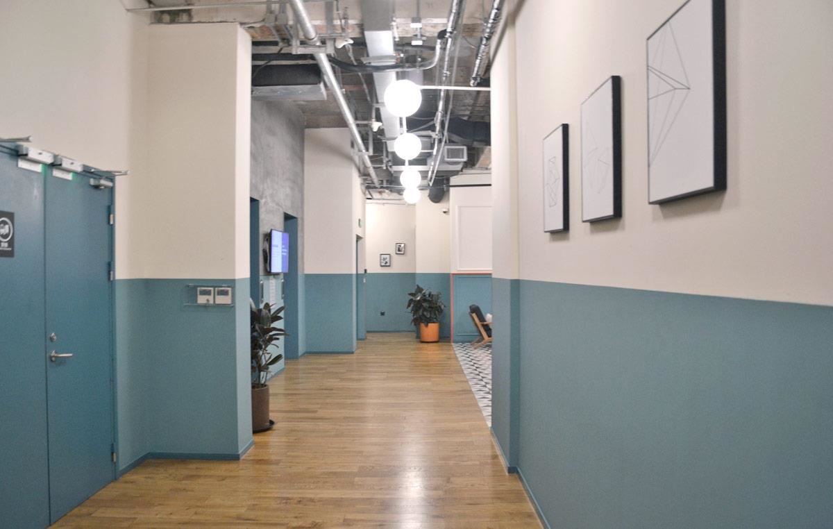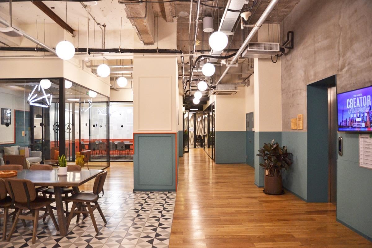 整栋楼以裸Loft风格进行装修整建,每层楼都以回字型的动线规划,方便人员走动,开放式的沙发共享区位于每一楼层的中心位置,后方隔断则是规画为一排Wework特色的玻璃隔断会议室、或办公间。