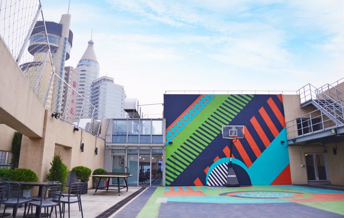 在线的小区营运是工作者最强大的后盾,透过官方App提出需求、发布活动讯息,让各城市会员在线就能呼朋引伴找到新伙伴!除此之外,云南路这栋WeWork在顶楼的天台设计也很有意思,外有俯瞰市区的篮球场与沙发区,内有吧台与阶梯是小沙龙空间。