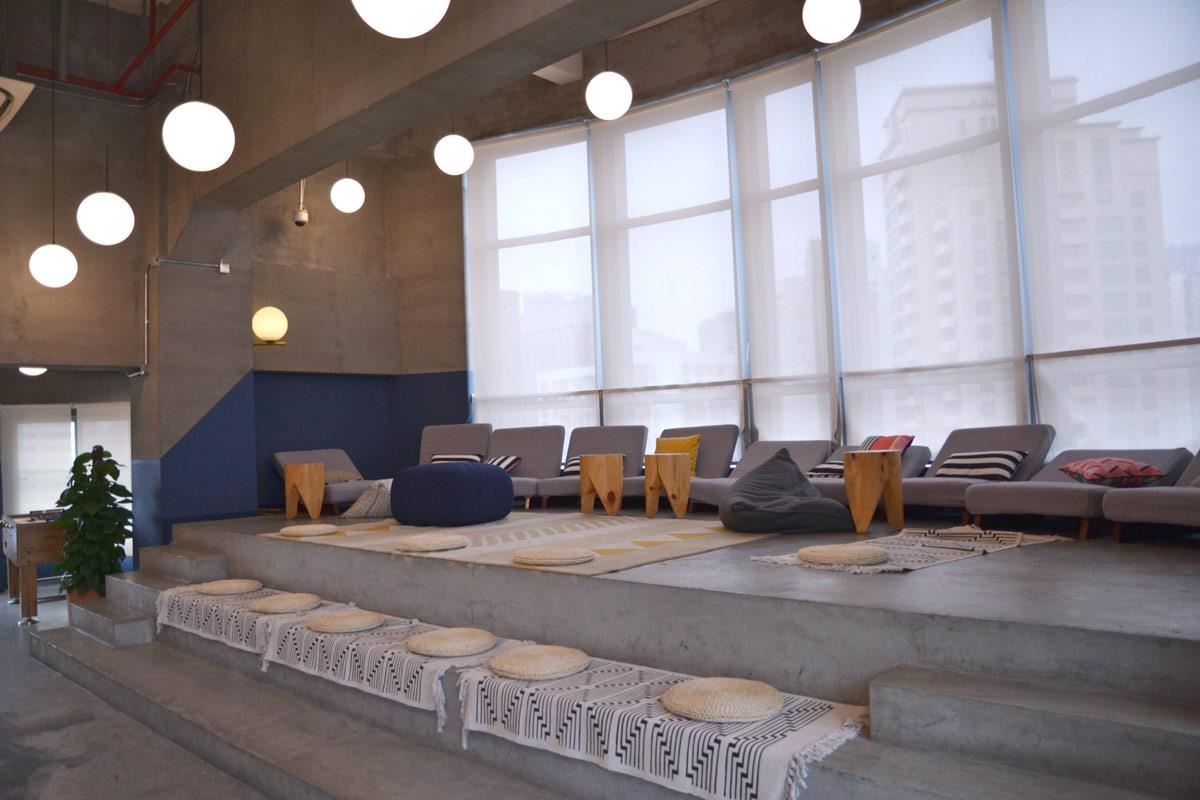 顶楼的室内阶梯式小酒吧:以一种小型沙龙聚会的开放环境,欢迎大家前来交流,配上北欧风格的抱枕坐垫,让创业者可以随时在一杯啤酒的时间内,轻松地展开交流。