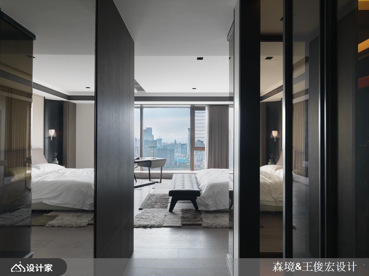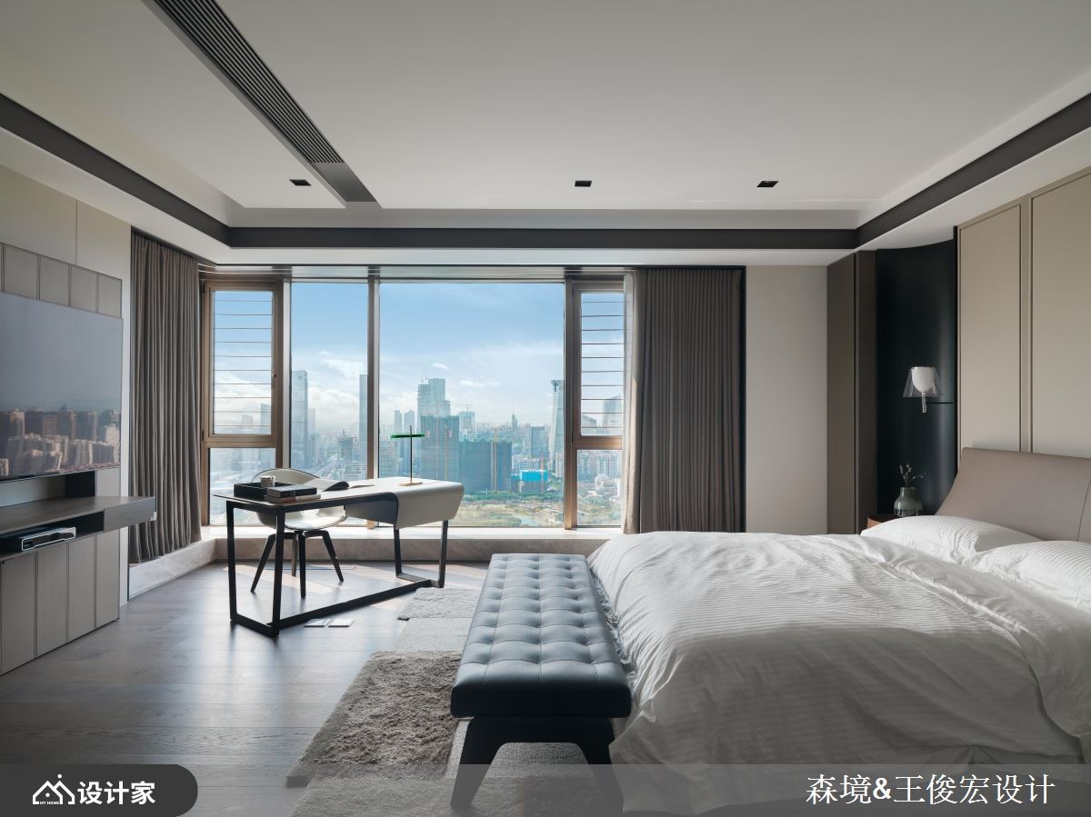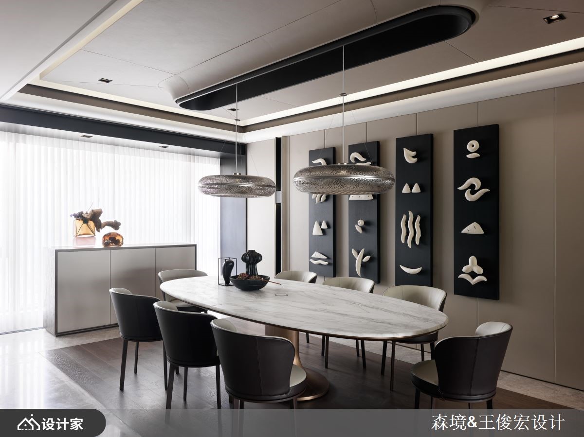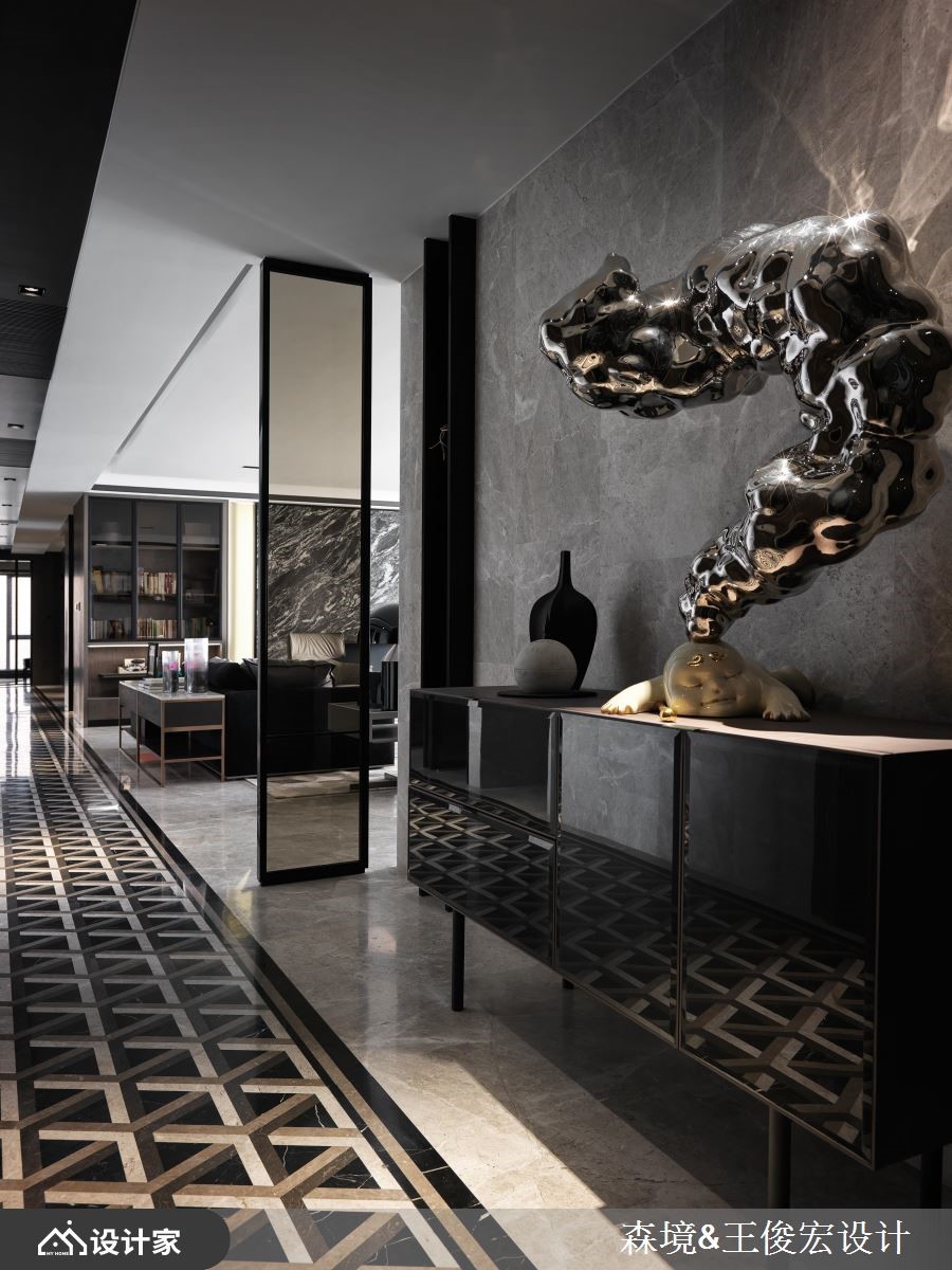 399 平方米现代风宅邸,一窗、一景皆如画,设计师善用此景观优势,空间安排以採光、窗景为优先,并将东方之美巧妙纳入西方简练设计,让屋主回家即感受隐身世外桃源的悠然自在。【质材搭佐家饰摆件,体现设计主轴】设计师将公领域呈开放型式,运用折门分野各领域,敞开即可将各场域相连结,让情感交流不受场域阻隔,赋予空间通透感又不失独立机能。廊道的地坪图腾、玄关壁面及客厅大面电视牆,选用不同样式的大理石纹,展现豪宅气场。不论是以龟甲文艺术挂画装饰的用餐空间,亦或廊道上具东方气息的艺术装置,皆可看见设计师精心挑选的风格摆饰,巧妙融入具西方设计感的俐落空间,体现中西合璧的设计理念。客厅区以透过玻璃落地窗延展了使用范围,将户外空间与室内连结;餐厅区则选用椭圆型餐桌,柔化空间稜线,将一家人情感交流凝聚于此圆形饭桌上;卫浴间以浅色调营造放鬆感,并打造一面淋浴房及浴缸区皆能饱览美景的落地窗,不浪费任何一处观景角落!小编的最爱走入卧室,氛围瞬间转换,设计师运用浅色系搭佐木质,呈现沉稳纾压气息。同样採用大落地窗设计,并将书桌安排紧临窗边,贯彻设计主轴,不管身处何处,皆可将日光美景尽收眼底!