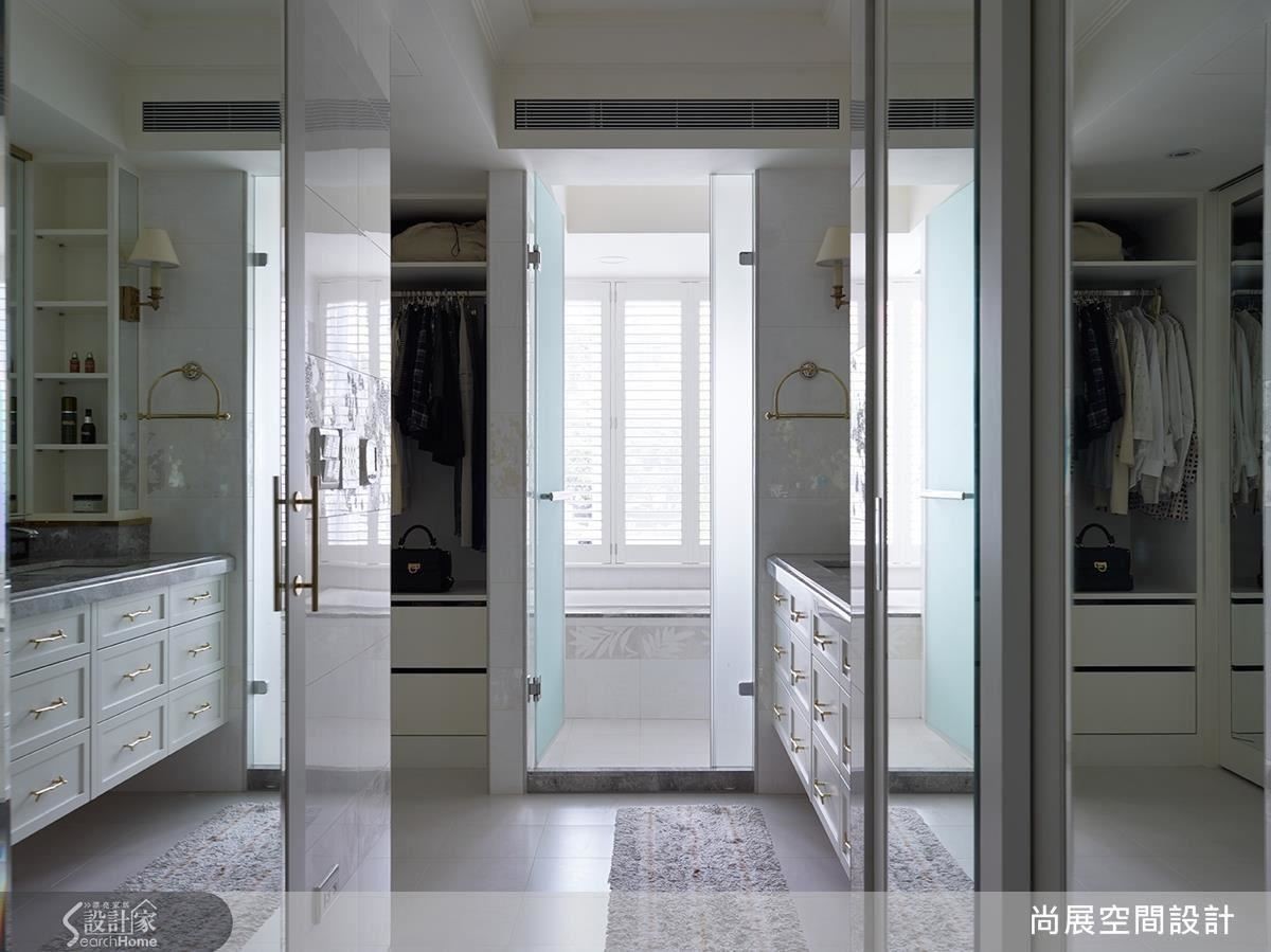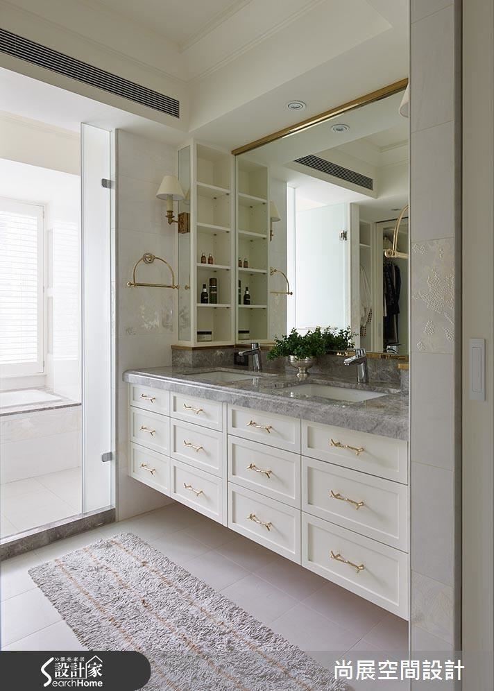 对于女性或主妇而言,能够纾压放松的浴室、比起其他场域似乎更为重要,除了必备的浴室隔断门,洗手台、独立式浴缸、地暖等机能也逐渐讲究。像是在此案,即将双盆洗手台独立于浴室外,底部定制三排收纳抽屉,妥善收整各种物品,并以金属镶饰柜体拉手、毛巾架、镜子等细节,表露美好的生活品味。
