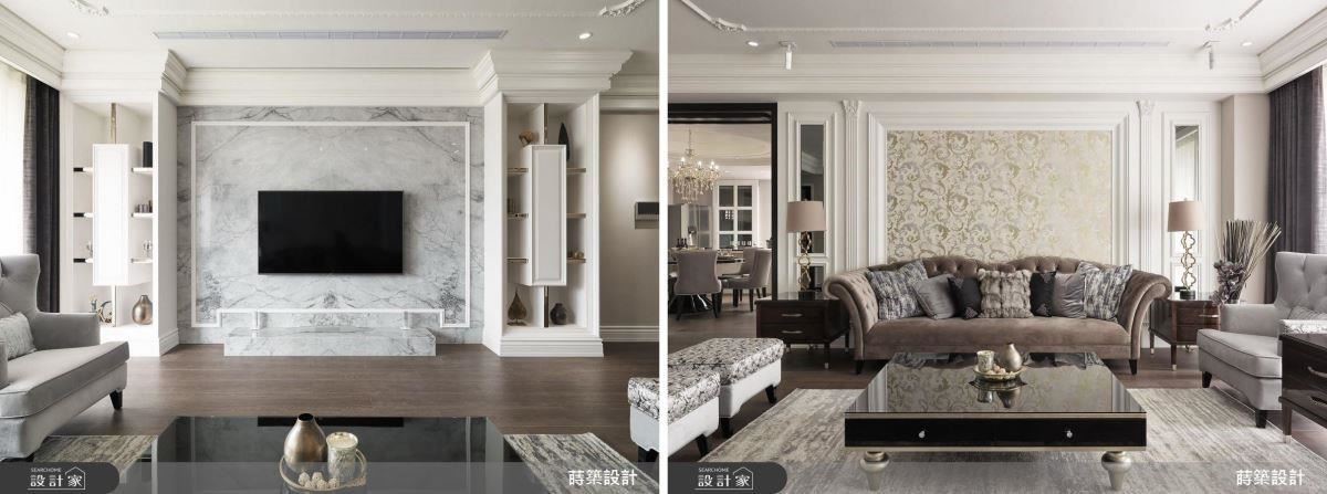 客厅电视墙两侧的收纳柜换个面貌,就成为很有型的墙面装饰,配合装饰柱的外型,将有柜门的收纳置中,开放架的隔板贴上茶镜,bling bling 隐约显现贵气。星空大理石的电视墙,因为加上木线板做框后再烤漆的白框细节,呈现更细腻的风格(左图)。