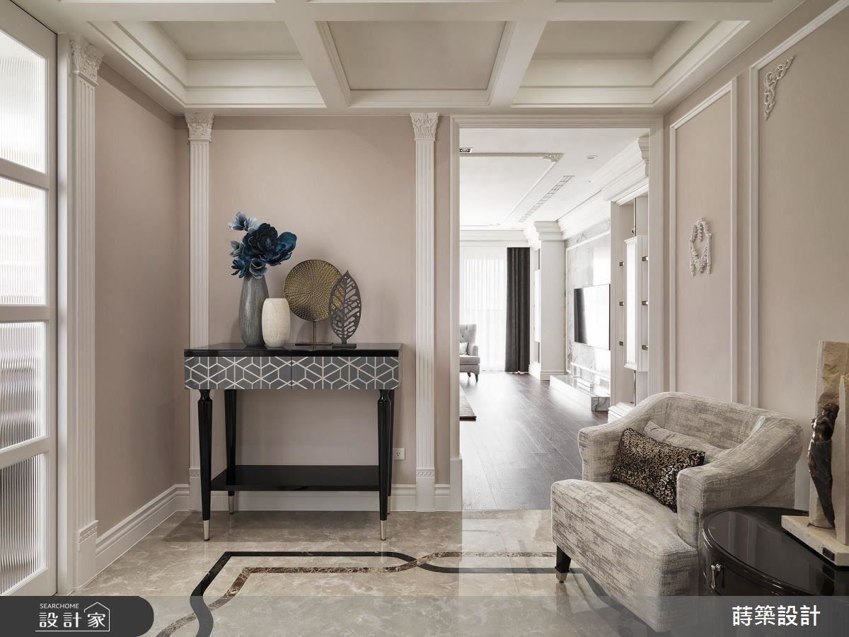 对照原始平面图,在进门右侧的小空间很难使用,于是扩大变成独立玄关,还能隔出一间约 3 平方米大的储藏室。利用复古长虹冰条玻璃做出拉门设计,引进采光,天花板做出九宫格状,中间十字包覆梁柱,而四角则往上拉高,反而营造出小客厅的氛围,令人惊艳。