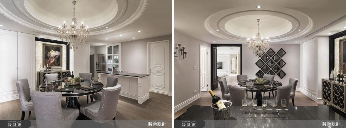餐厨空间的中岛吧台与备餐台虽然是配角,但莳筑团队并没有忽略细节。中岛台面采用黑金石,四边做出缩小版的装饰柱脚,连台面都依照装饰柱形状切割,非常细腻(左图)。