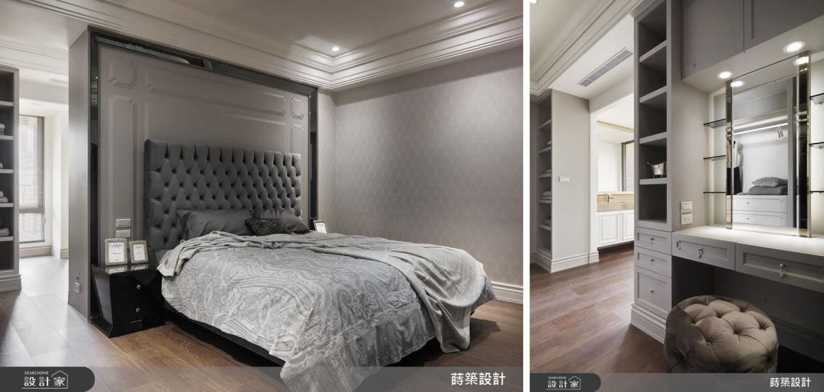 次卧之一的儿子房间,床头背墙以浮雕感的线板搭配灰镜做成的粗框,还有灰色的绷布床头背板,三种不同的灰营造沉稳的大器感,背面则是更衣室整排的衣柜,简单又有型(左图)。