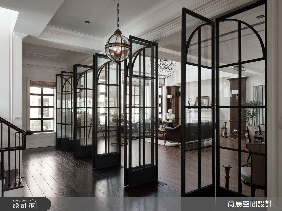 步入玄关,刻意透过铁件玻璃拉门与开放格局的规划,让客餐厅之间彼此通透。经典美式的格子拱门设计则延伸出柔美优雅的弧度,间接强调整体的挑高感受。