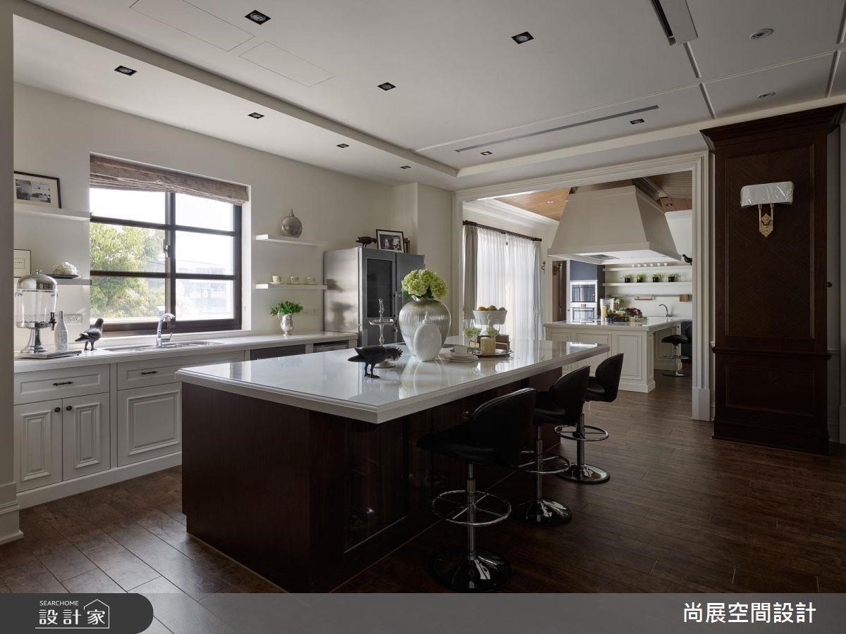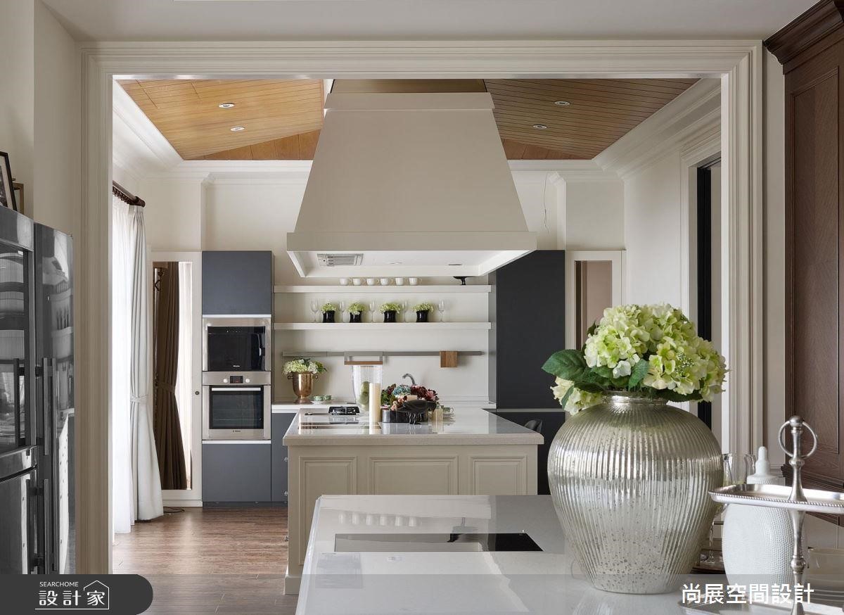餐厨空间呈现开放设计,再加上将燃气灶配置在空间中央,为了让视觉更美观,特地在厨房上方以梯形油烟罩修饰抽油烟机的存在。厚重具份量的油烟罩能吸人眼球,辅以纯白的优雅色系呈现欧美大宅的经典美感。