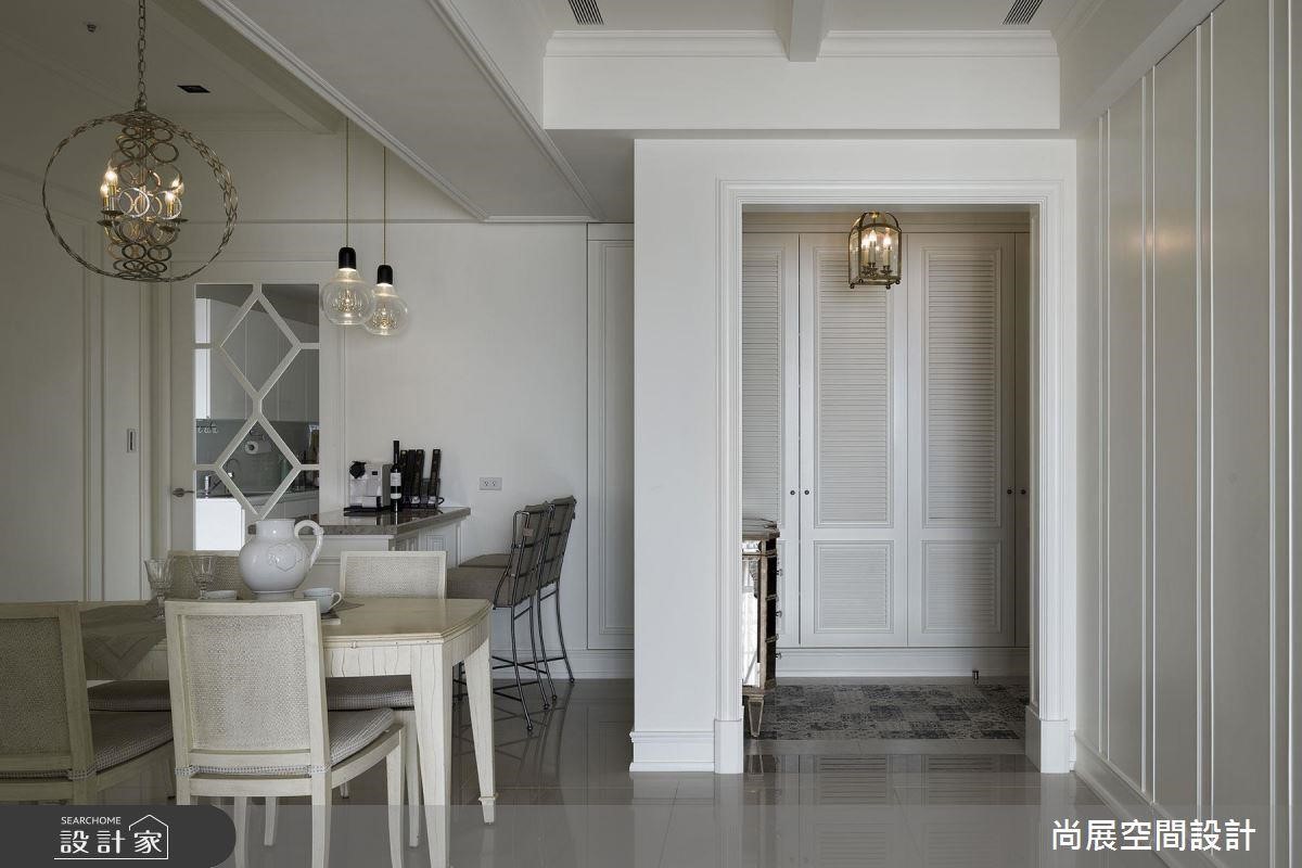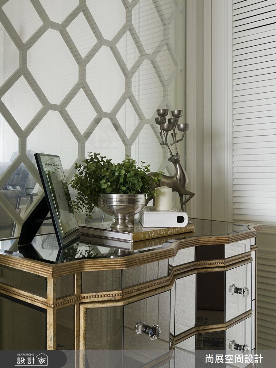 一入玄关即可看到镶嵌镜面的复古桌几,搭配百叶柜门的典雅设计,成为优雅大器的迎宾风景。为了维持通透度,玄关墙面特地采用镂空隔屏,并辅以菱纹切割和复古镜,注入古典韵味。
