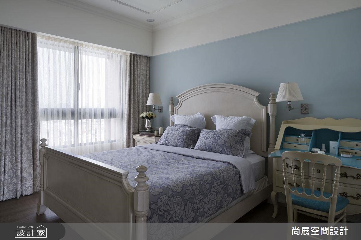在需要安静沉眠的主卧,特地在床头主墙以优雅的淡蓝色作为主轴,降低饱和度的清新色系,能有效沉静空间氛围。两侧更搭配古典壁灯,对衬的设计更彰显复古典雅的美式风情。