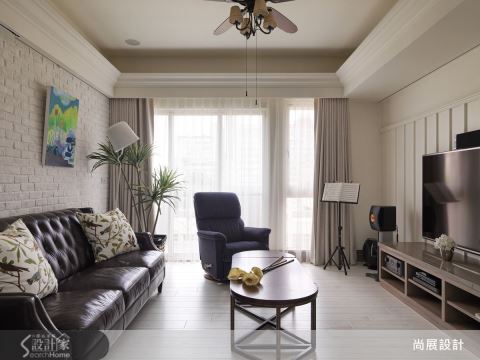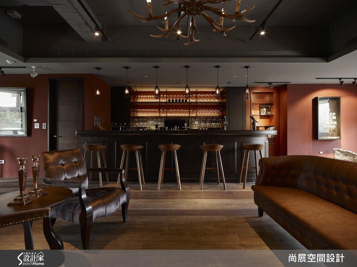 吧台区本身则规划整面柜体,不仅满足机能,更搭配间接光源和复古灯饰,更让璀璨酒杯衬着唯美光晕,构成具张力的视觉画面,俨然是现成的风格装饰。