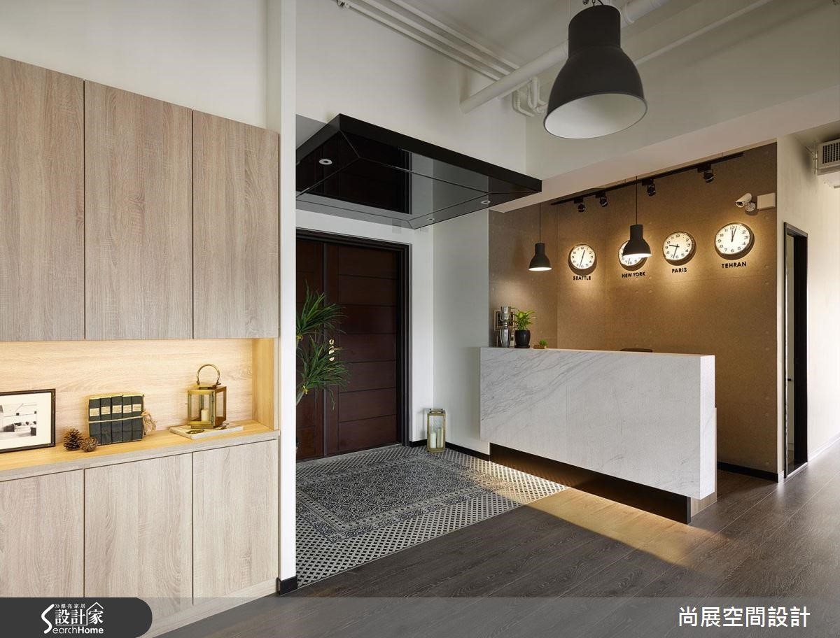 玄关地面铺陈大面积拼花磁砖,塑造优雅的入门景象。一旁采以沉稳大理石打造接待柜台,墙面更巧思安置西雅图、纽约、巴黎、德黑兰等主要生意往来城市的时钟,标示公司营运的属性,凸显国际感。