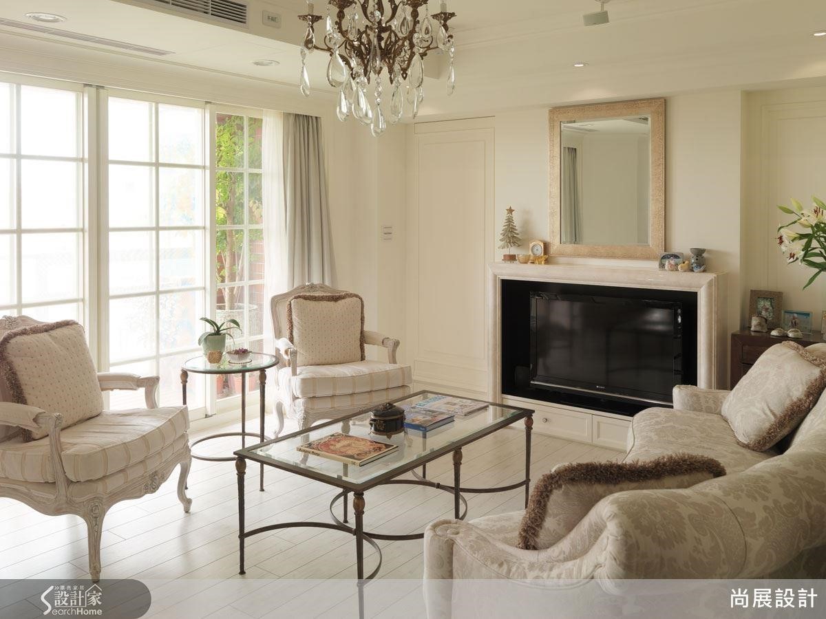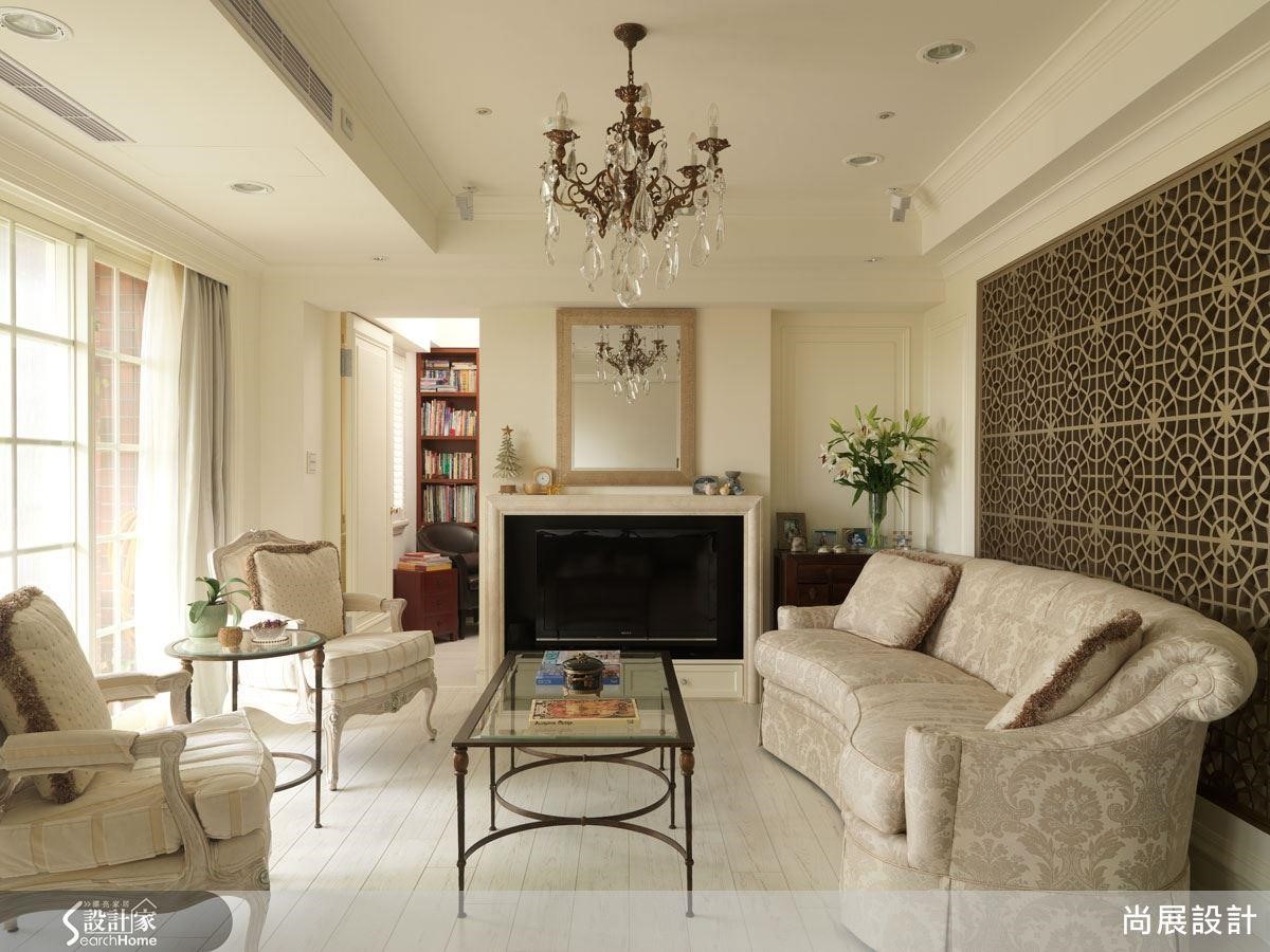 客厅空间以清雅素淡的米白色系为主,搭配有着柔美图腾装饰的沙发与单椅,充分展现优雅的法式情调。电视墙则结合壁炉造型,左右两侧的对称设计更呼应古典风格,也让书房门隐于造型之中,处处可见设计师的用心。
