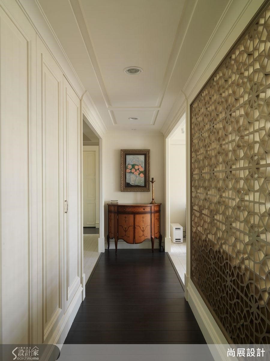 更动玄关格局形成廊道,让动线了转折成二进式设计,赋予空间真正的欧式建筑灵魂。玄关廊道吊顶以优雅的弧形细腻修饰,与底端的法式复古木柜形成呼应。