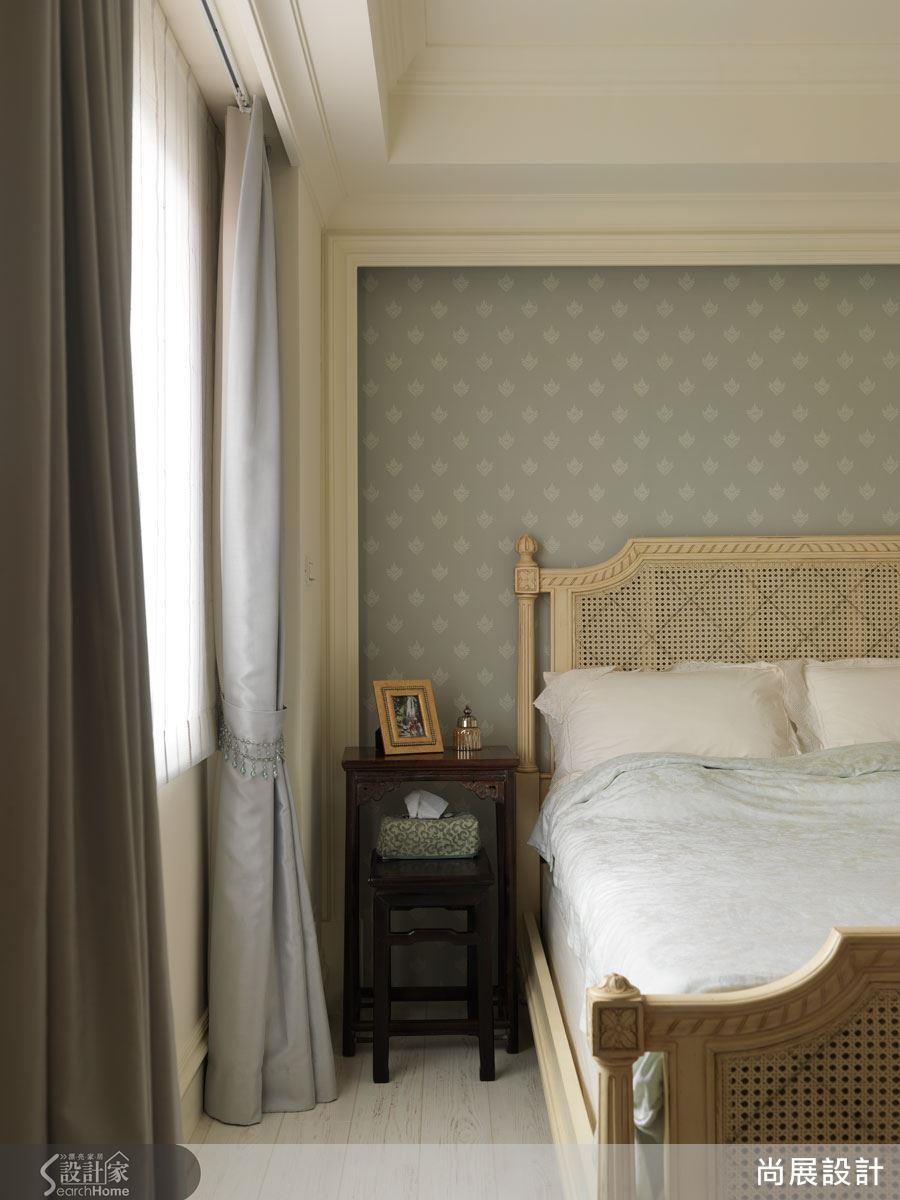 简约的主卧空间仅利用古典图腾墙纸点缀,营造柔美气息,带有灰绿色调能稳定氛围。搭配藤编床框与深色木质床边桌更显静谧而舒适,营造纾压的睡眠空间。