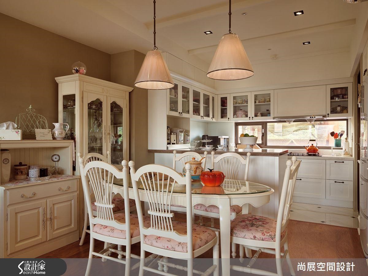 厨房不做隔断,改以吧台分隔餐厨区域,不仅多了备料的空间,也延展视觉有效扩容。吧台表面设计简约线板,再搭配小碎花餐椅,圆润简单的古典线条,流露质朴的乡村味道,瞬间提升温馨的用餐氛围。