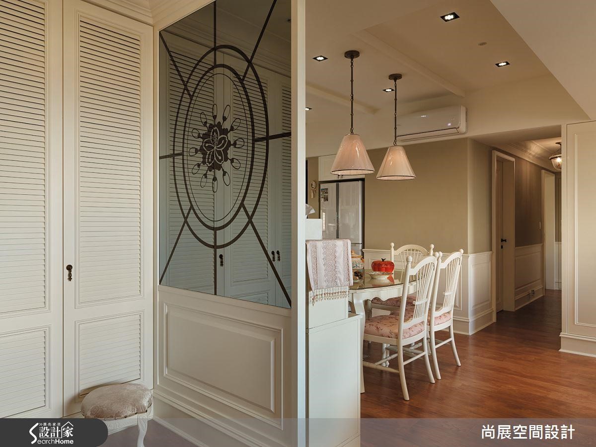 沿著玄关墙面设置鞋柜,满足日常收纳需求;百叶门片的设计不仅有通风效果,也让美式元素开始深入居家。顺应鞋柜拉出L形屏风,巧妙切割出玄关空间,搭配放射状图腾的镜面,方便出门前整理仪容,也传达屋主的鲜明个性。