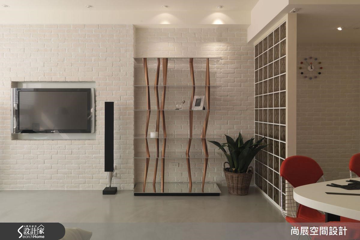 在客厅电视墙搭配日本建筑师伊东豊雄所设计的「仙台书架(Sendai Bookshelf)」,层层玻璃与木支架交错组合,交织成独特的美感造型,融合文化石的浮凸背景,更具人文质调。