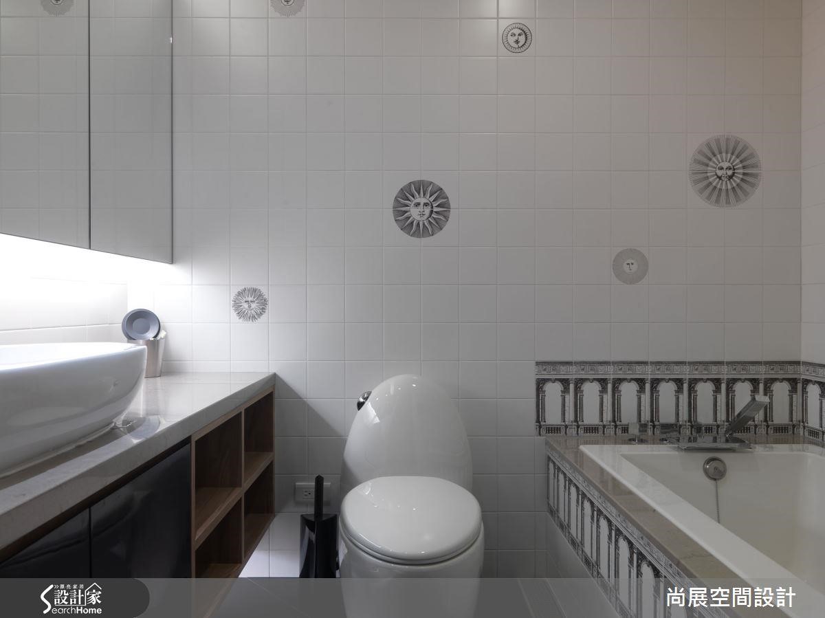 卫浴空间全室铺陈净白的磁砖,而磁砖特地选用小型的正方尺寸,整齐的铺排下让视觉更为简洁利落。并妆点意大利插画名家绘制的图案,在平凡中展现高雅的艺术性。