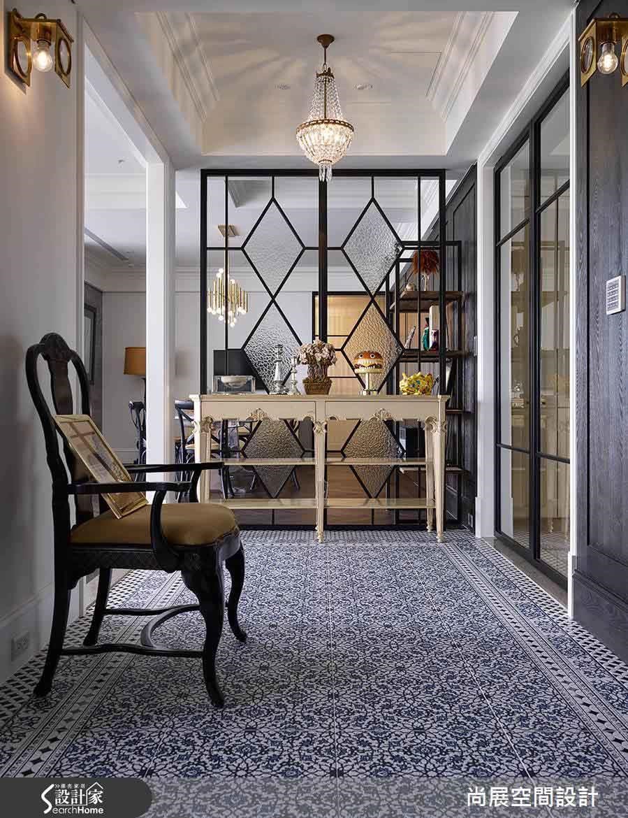 从玄关步入,绚丽的靛蓝色花砖向前蔓延,一眼望入菱形的镂空隔屏,堆栈出美式的古典韵味。同时在隔屏前方配置复古玄关桌,为日常生活开启华丽细致的印象。