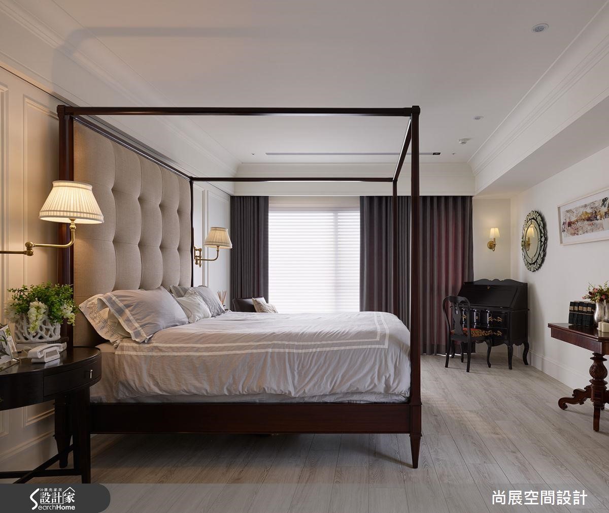 有着足够面积的宽敞卧室,仅在天花以线板修饰,保留简约清爽的设计。一张气派端庄的四柱大床成为卧室的风格主角,厚实的绷布与四柱造型,展现浓厚的美式韵味。墙面则搭配对称的古典壁灯,成为细致的迷人点缀。