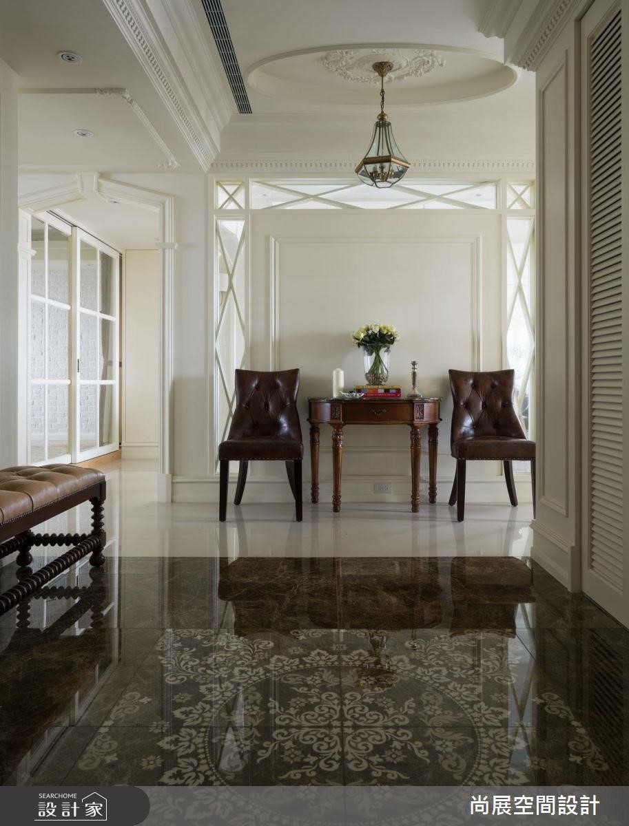甫入门即能见到一道隔断,拉出玄关深度,并以大理石拼花地板暗示玄关和客厅界线。走道入口则采用拱门造型,形成通过两扇门的二进式动线,能彰显大宅的开阔,也融入走道机能,避免产生无用区域。