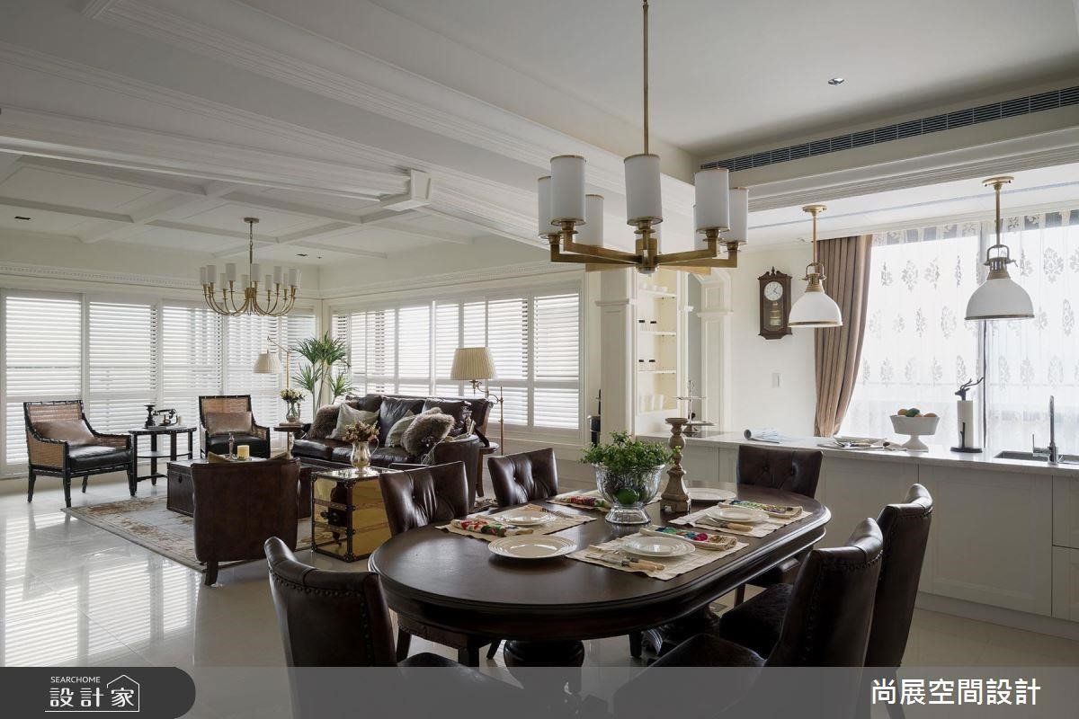 此案重现地道美式大宅格局,透过二进式的动线、拱门造型和线板,让古典韵味华丽再现。再搭配拉扣皮椅、复合金属柜体和弧形碗橱等仿旧家具,让人宛如身处18世纪的殖民风格时代,从气度、格调到采光,在在成为大宅典范。