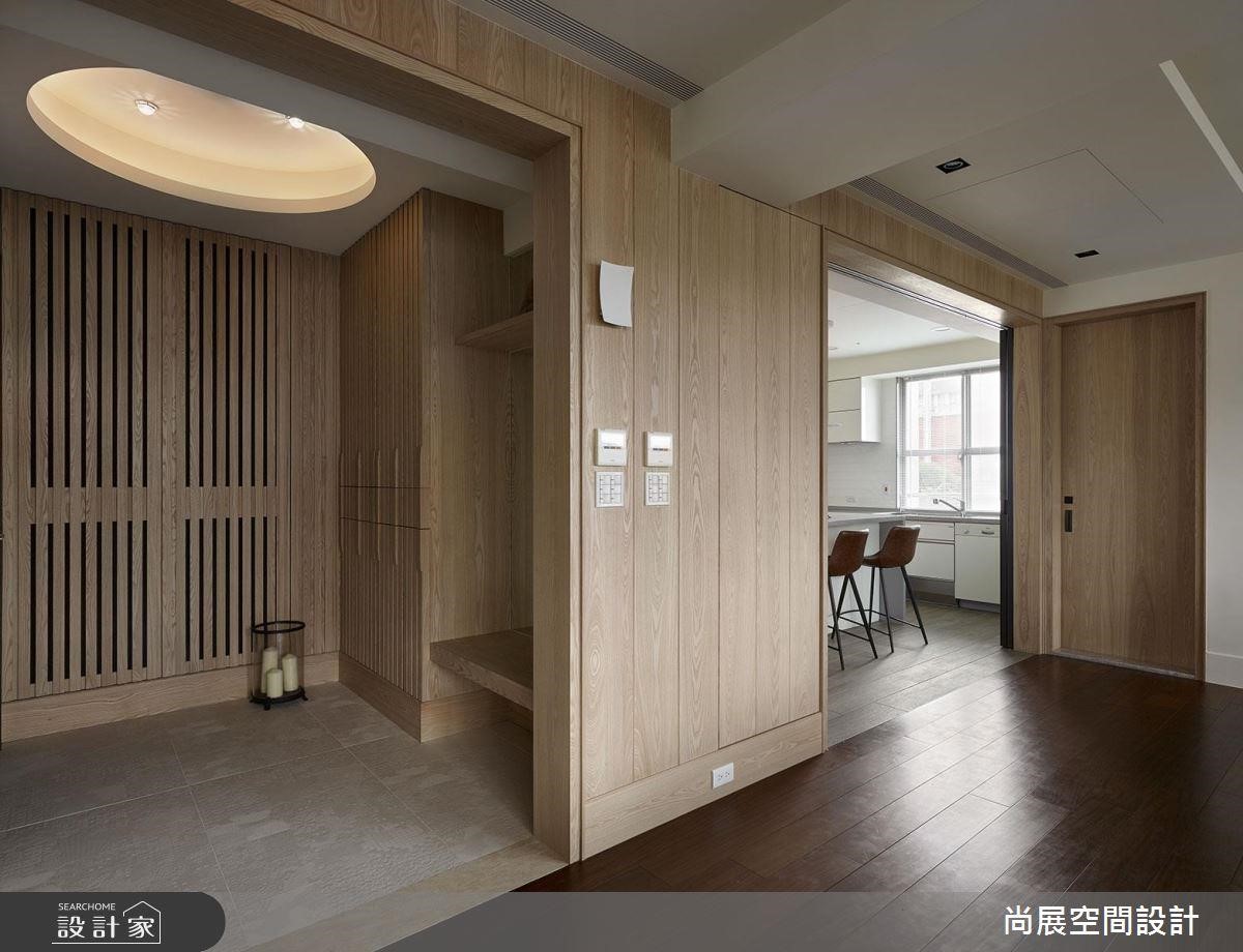 考量到随著年龄增长,渐渐会有腰腿无力的困扰。特地在玄关处设置穿鞋区域,让屋主能好好坐下,穿脱鞋子更安全。鞋柜采用格栅线条的设计,把手顺势加厚,创造一致的直线视觉,而凸把手的设计也能作为辅助爸妈坐下的支撑工具。