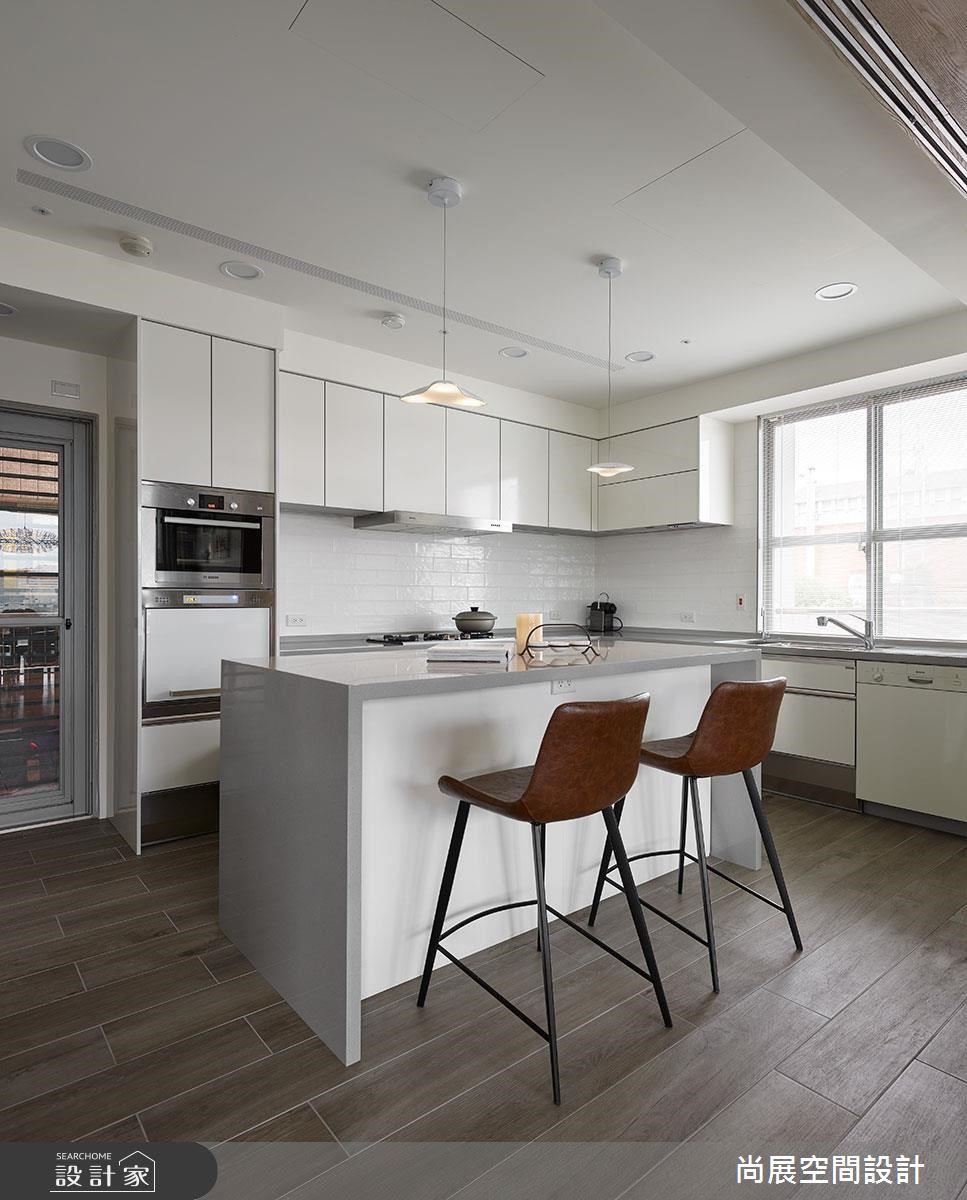 由于原有的厨房空间较小,且一字型的厨具不敷需求。因此隔断外移,扩大厨房,并改为U字型设计,料理就能更为宽敞舒适。同时中央设置中岛,不仅多了用餐吧台和备料区域,所有动线也环绕中岛而行,左右进出都方便。