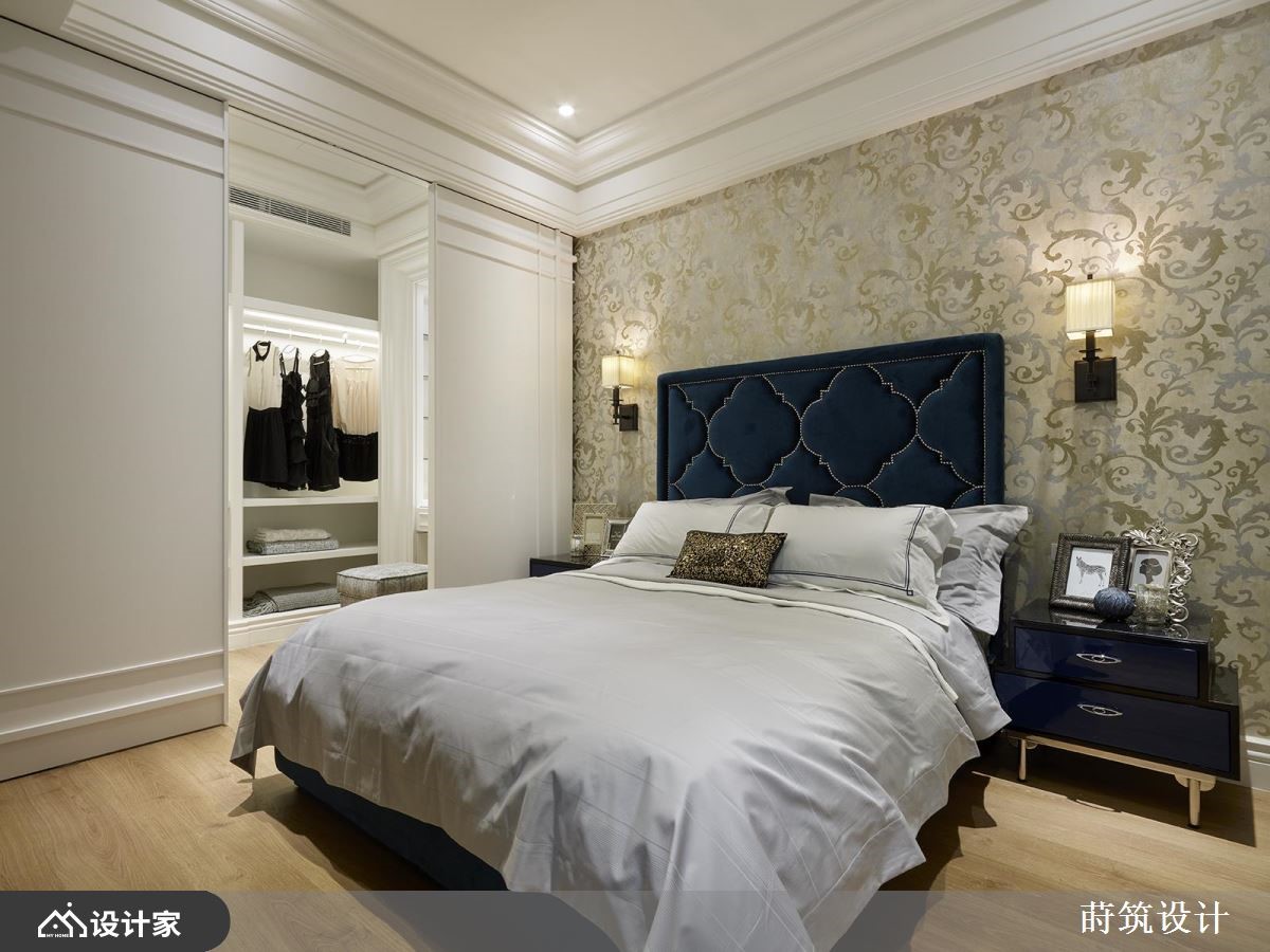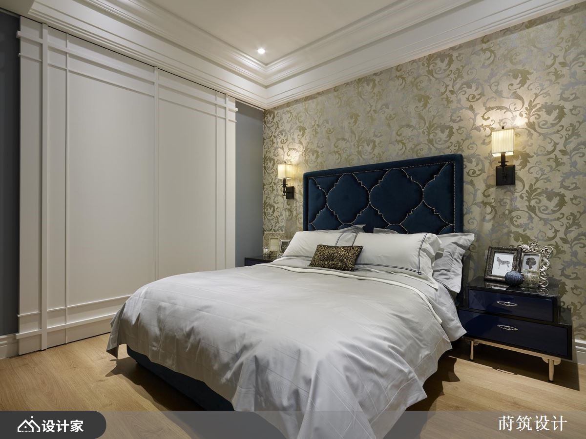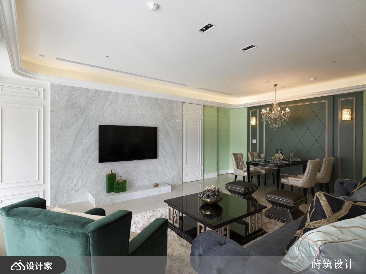 这间132平方米的新古典四口之家,公共空间富丽却不过于矫饰,私领域则隐藏于墙面中,一道道门推开,还可以通往深处的更衣室,就像是古代欧洲宫廷一样,处处饱含玄机。【是门也是壁,如同华丽宫廷】客餐厅用湖水绿佐草绿色,成为空间布置的核心色彩;天花板圆润掉边角,渗出微光,展现雍容华贵的气度。沙发背墙以装饰线条框住茶镜与铁窗花墙纸,凸显出空间的高雅感受;大理石电视墙搭配两侧的纯白装饰线条,暗藏后方的厨房、卧房等生活格局,不仔细看,很难发现门在哪里呢!餐厅水晶吊灯的摇晃光影,映照在彷佛镶有绿宝石的菱形纹路墙面,并以金属线条圈住了两盏壁灯,提升用餐空间的质感。白色镂刻的折叠门分隔出书房空间,层次丰富的收纳柜满足展示需求,并将充沛的自然光引入,使得阅读时刻可以相当舒适。小编的最爱拥有普鲁士蓝床头板的卧室,在伪装成墙面的白门后,隐藏着以镜面扩容的更衣室,满足收纳功能的同时,也保持了卧室的简洁。