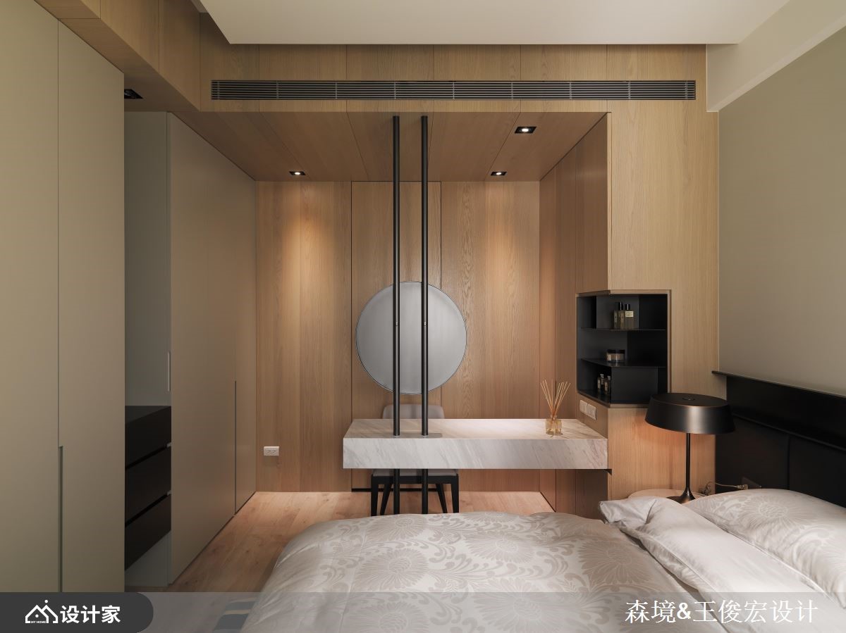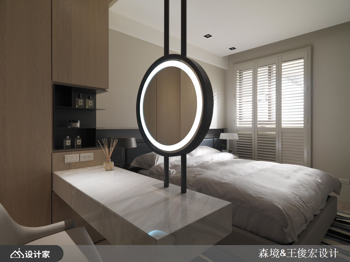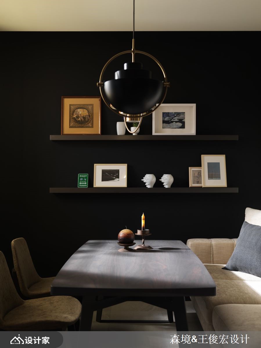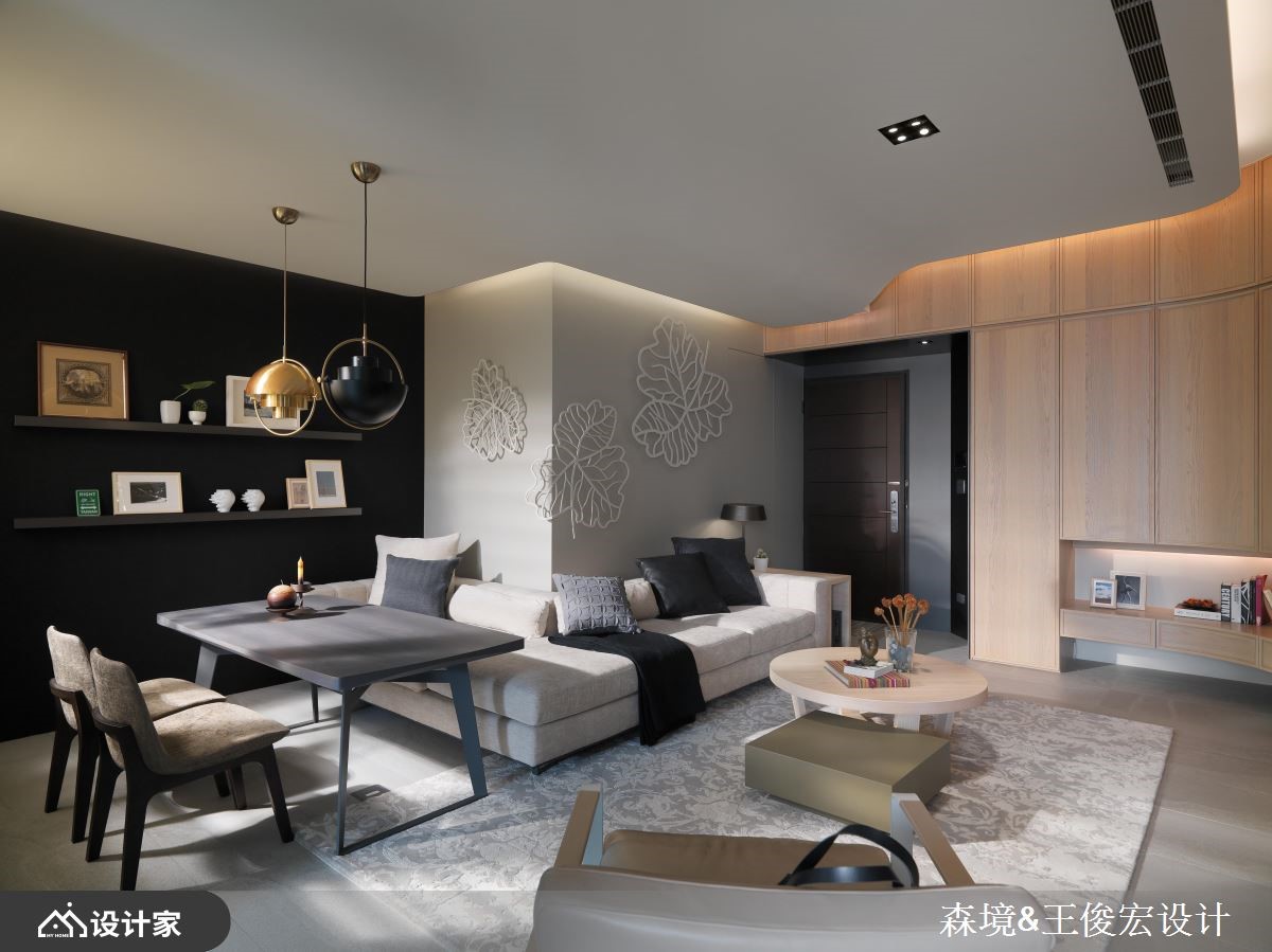 73 平方米简约风住宅,利用相同元素串起空间连结性,为单身宅定调出圆滑自在的生活动线,型塑出单人生活样貌,即使一个人呆在家也能从一面牆饰牆、一处日光角落或是沙发用餐区,独自品味生活乐趣。 【巧用圆形意象,串连生活场域】入门后,整面木质电视牆将收纳隐藏于无形,感受出简约风格的的设计语彙,转角处以特殊圆弧设计隐匿直角的俐落,将设计主轴「圆」完美演绎。沙发背牆以大型装饰艺术点亮空间,与 L 型沙发一起沿壁面直角转弯,连接了用餐空间。牆面装饰、用餐区刷上黑色调的层架展示牆以及化身用餐区的沙发座椅,让两空间相互兼容却各自享有独立场域及特色。紧邻厨房一处日光角落规划为书房,善用转角特性,藉由两侧窗户的设计延揽充足光源。卧房以木质地坪佐格纹地毯,将有暖度的空间加以变化,床铺旁设计一阅览、梳化空间,以大理石桌面带出了低调奢华质感,并巧用一面镜子及铁件分野出卧房内的两个场域。 小编的最爱 小细节窥见设计师的用心,从转角处的设计、餐桌灯具选用、床头柜与对称的床头灯以及卧房圆镜,皆可看出相同元素以不同形式呈现,贯彻了设计主轴,同时赋予视觉空间更多变化。