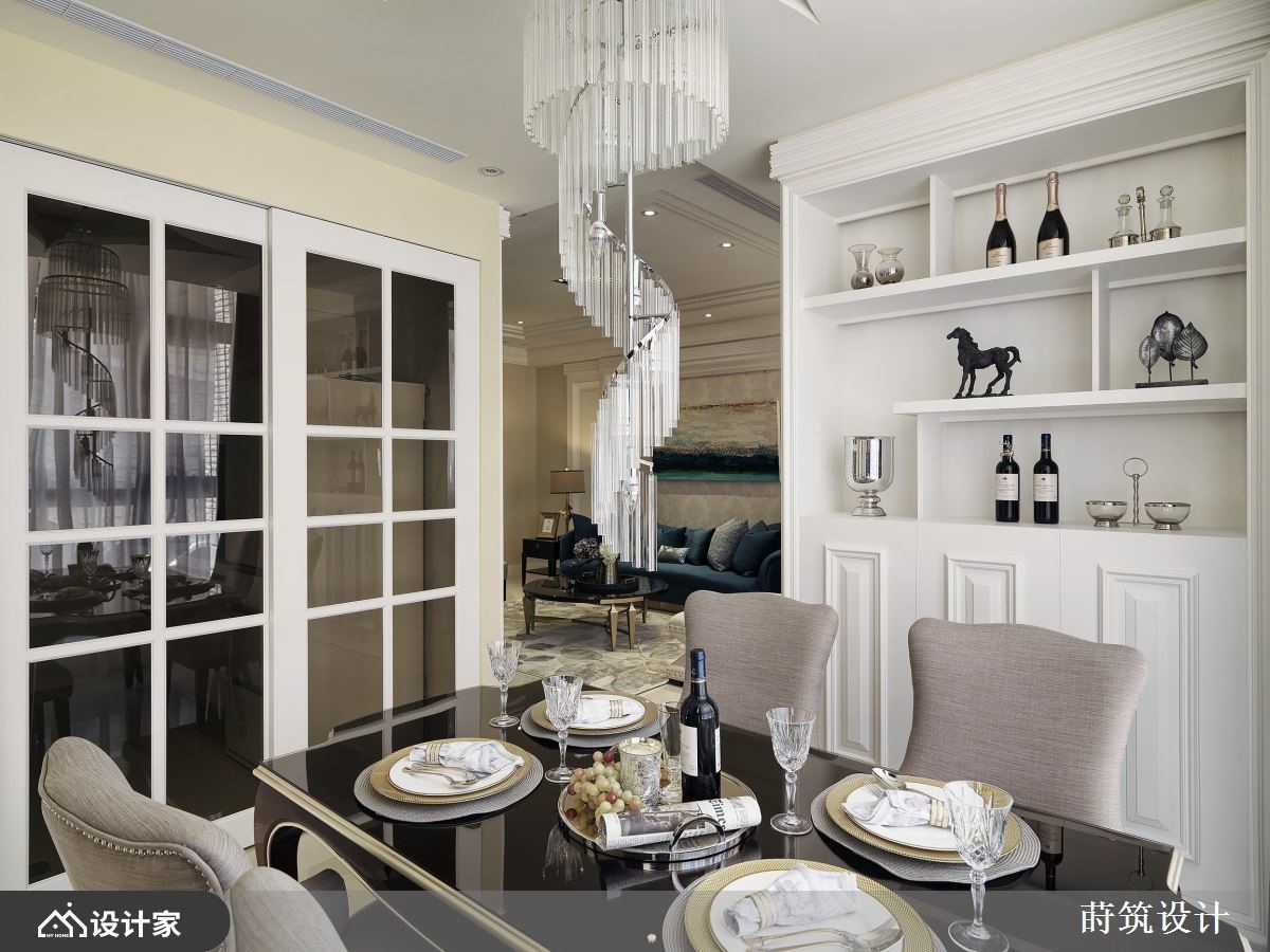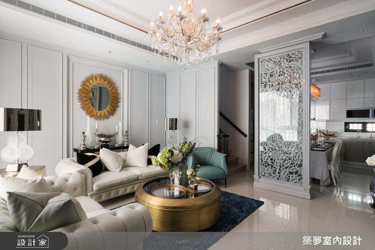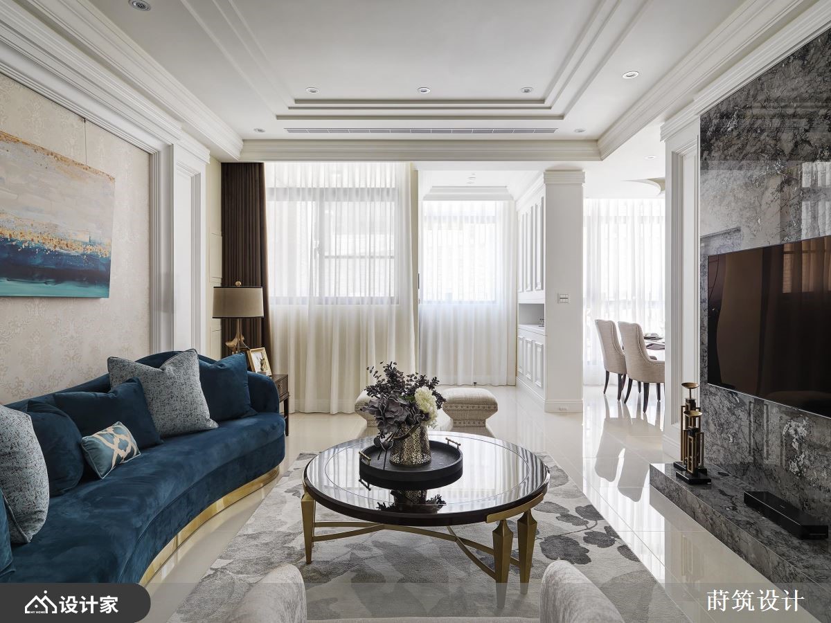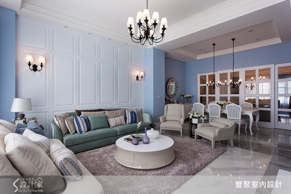 251 平米的新古典独栋楼,透过甜品般的色彩搭配,在充足自然光的照射下,让三代同堂的奶油色住宅,包裹色彩丰富的蜜糖风味,打造高雅柔美的居家场域。【优雅颜色,营造甜品系的别墅气氛】客厅采用柠檬塔的酸甜口味妆点墙面,水蓝色的沙发跳脱出室内的鲜明活力,而电视墙选择了深色大理岩材质,与雪白线板形成对比。和厨房以一道玻璃推拉门分隔的餐厅,在造型天花板悬挂宛若水晶旋转梯的灯具,提升居家的格调。另外,纯白展示柜同时担任门厅隔屏的角色,界定了室内格局。离开一楼的公共空间,二楼贴心地安排次卧室与孝亲房,让长辈上下楼可以更为方便。彷佛芋泥蛋糕卷的次卧,在窗边设置书桌,营造明亮的阅读场域。孝亲房则带来提拉米苏的微苦,替操心一辈子的母亲规划舒适的休憩空间。主卧位于三楼阳台旁,可丽露的口感中藏着草莓色的更衣间及化妆台。小编的最爱更衣间在水晶吊灯的映衬下,显现填满少女情怀的轻柔色彩,而开放式的柜体设计,展示家人的服装品味。