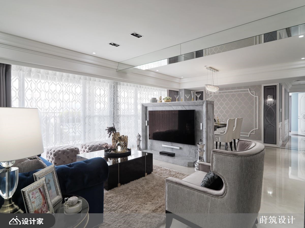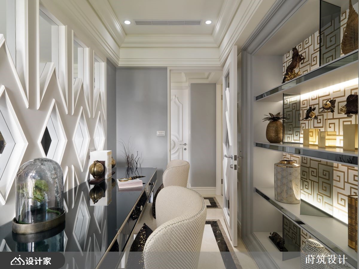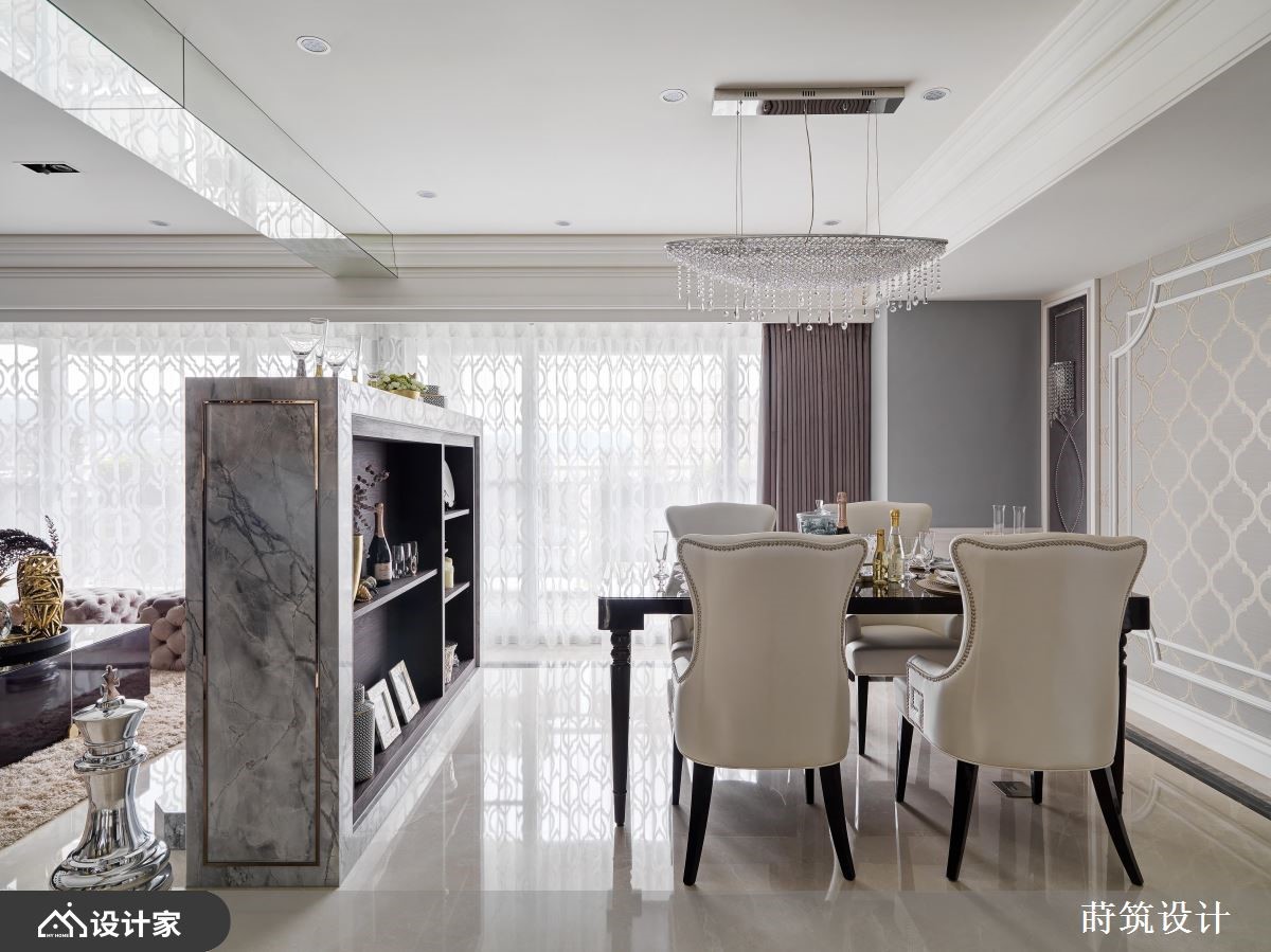 以新古典风格作为主导,利用石材、镜面的比例切割,利落的线条描绘出空间层次感,优雅的线条游走于壁面、布艺的细节变化与华美色彩的堆栈,营造出高贵、华丽的美学风尚。【成就浪漫的欧式飨宴】玄关以大理石铺陈,深浅线条交织地坪独特风情,弧形线条描绘出鞋柜造型,底部墙面界定内外领域,天然石材般的凹凸立面,前方摆设的精致矮柜上陈列艺术雕塑品,伴随嵌灯映照下,形塑动人的端景视觉。客厅里,利用半高电视墙区隔客厅与餐厅领域,墙体两侧留出动线,让室内更显开放、流动感;电视墙上方巧遇大梁,利用镜面消弭结构感,与沙发背墙的镜面设计相互呼应,视觉反射的材质特性更延伸室内情境,达到扩容。菱形线条创造沙发背墙造型,替新古典的风格意象注入精彩层次,后方为屋主平时阅读的书房区,室内特别安排一面展示空间,以透明的玻璃隔断,随着艺术品的陈列,转换精采的居家风貌。电视墙背面作为器皿展示,增添人文艺术之美,金葱线条的复古壁纸结合弧形框线板,勾勒出餐厅主体墙,天花板垂挂一盏水晶吊灯,典雅餐桌椅的迷人姿态,成就浪漫的欧式飨宴。